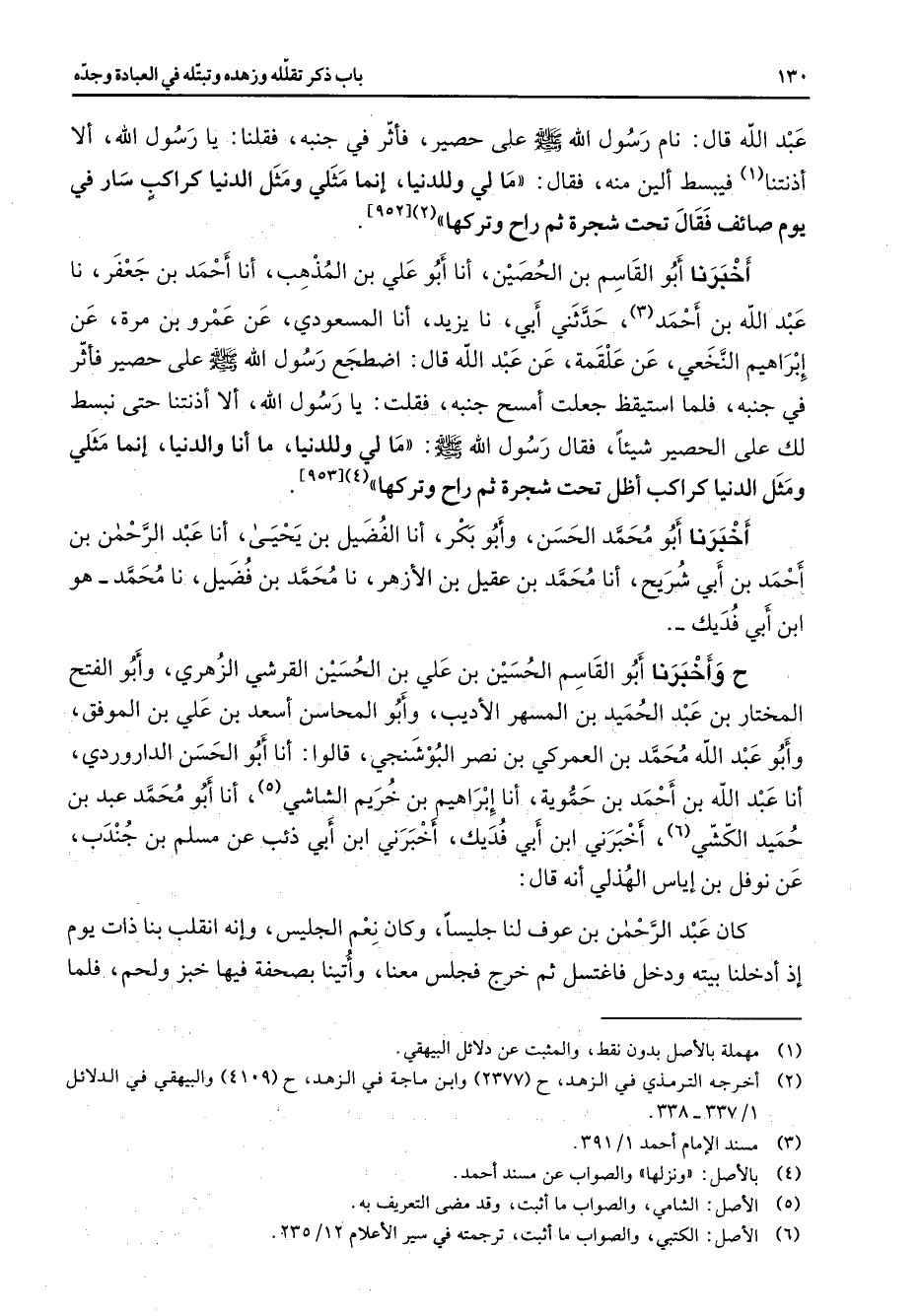 [952] أخبرنا أبو القاسم بن الحصين أنا أبو علي بن المذهب أنا أحمد بن جعفر نا عبد الله بن أحمد (3) حدثني أبي نا يزيد أنا المسعودي عن عمرو بن مرة عن إبراهيم النخعي عن علقمة عن عبد الله قال اضطجع رسول الله (صلى الله عليه وسلم) على حصير فأثر في جنبه فلما استيقظ جعلت أمسح جنبه فقلت يا رسول الله ألا أذنتنا حتى نبسط لك على الحصير شيئا فقال رسول الله (صلى الله عليه وسلم) ما لي وللدنيا ما أنا والدنيا إنما مثلي ومثل الدنيا كراكب أظل تحت شجرة ثم راح وتركها (4)