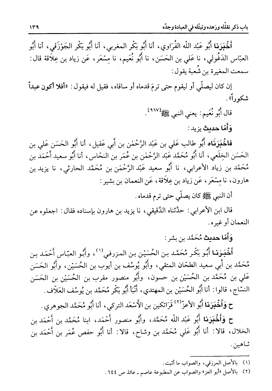 [967] وأما حديث يزيد فأخبرناه أبو طالب علي بن عبد الرحمن بن أبي عقيل أنا أبو الحسن علي بن الحسن الخلعي أنا أبو محمد عبد الرحمن بن عمر بن النحاس أنا أبو سعيد أحمد بن محمد بن زياد الأعرابي نا أبو سعيد عبد الرحمن بن محمد الحارثي نا يزيد بن هارون نا مسعر عن زياد بن علاقة عن النعمان بن بشير أن النبي (صلى الله عليه وسلم) كان يصلي حتى ترم قدماه قال ابن الأعرابي حدثناه الدقيقي نا يزيد بن هارون بإسناده فقال اجعلوه عن النعمان أو غيره وأما حديث محمد بن بشر أخبرنا أبو بكر محمد بن الحسين بن المزرفي (1) وأبو العباس أحمد بن محمد بن أبي سعيد الطحان المتقي وأبو يوسف بن أيوب بن الحسين وأبو الحسن علي بن محمد بن الحسين بن حسون وأبو منصور مقرب بن الحسين بن الحسن النساج قالوا أنا أبو الحسين بن المهتدي أنبأ أبو بكر محمد بن يوسف العلاف ح واخبرنا أبو الأعز (2) قراتكين بن الأسعد التركي أنا أبو محمد الجوهري ح وأخبرنا أبو عبد الله محمد وأبو منصور أحمد ابنا محمد بن احمد بن الخلال قالا أنا أبو علي محمد بن وشاح قالا أنا أبو حفص عمر بن أحمد بن شاهين