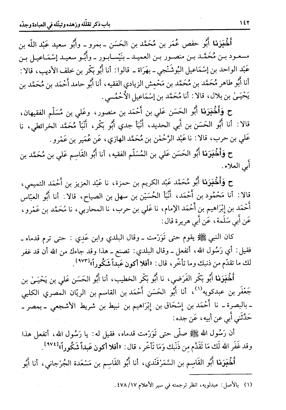 أخبرنا أبو حفص عمر بن محمد بن الحسن بمرو وأبو سعيد عبد الله بن مسعود بن محمد بن منصور بن العميد بنيسابور وأبو سعيد إسماعيل بن عبد الواحد بن إسماعيل البوشنجي بهراة قالوا أنا أبو بكر بن خلف الاديب قالا أنا أبو طاهر محمد بن محمد بن محمش الزيادي الفقيه أنا أبو حامد أحمد بن محمد بن يحيى بن بلال قالا أنا محمد بن إسماعيل الأحمسي ح وأخبرنا أبو الحسن علي بن أحمد بن منصور وعلي بن مسلم الفقيهان قالا أنا أبو الحسن بن أبي الحديد أنبأ جدي أبو بكر أنبأ محمد الخرائطي نا علي بن حرب قالا نا عبد الرحمن بن محمد الهازي عن عمير بن عمرو ح وأخبرنا أبو الحسن علي بن المسلم الفقيه أنا أبو القاسم علي بن محمد بن أبي العلاء ح وأخبرنا أبو محمد عبد الكريم بن حمزة نا عبد العزيز بن أحمد التميمي قالا أنا محمود بن أحمد أنبأ الحسين بن سهل بن الصياح قالا أنا أبو العباس أحمد بن إبراهيم بن أحمد الإمام نا علي بن حرب نا المحاربي نا محمد بن عمرو عن أبي سلمة عن أبي هريرة قال كان النبي (صلى الله عليه وسلم) يقوم حتى تورمت وقال البلدي وابن عدي حتى ترم قدماه فقيل أي رسول الله أتفعل وقال البلدي تصنع هذا وقد جاءك من الله أن قد غفر لك ما تقدم من ذنبك وما تأخر قال أفلا أكون عبدا شكورا