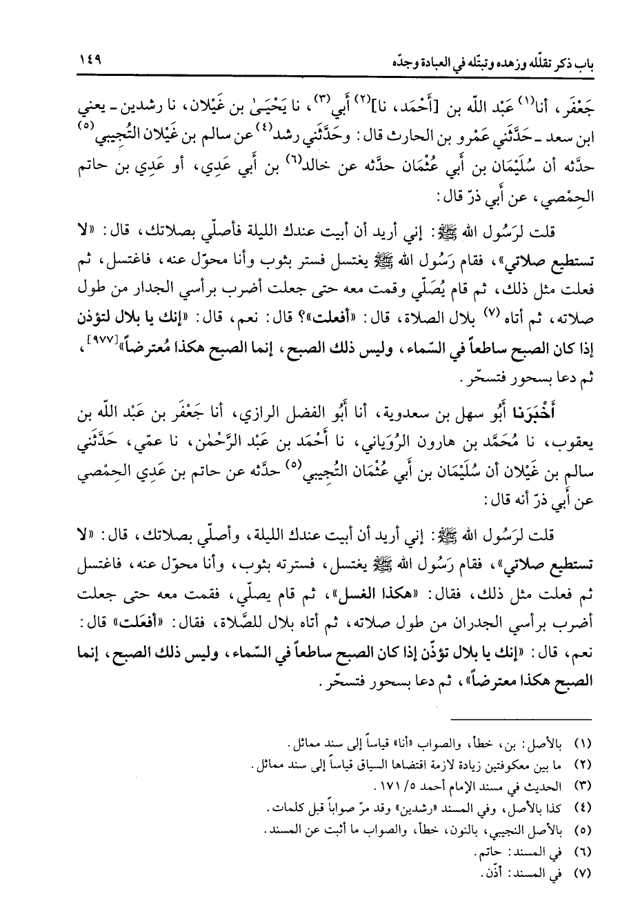 جعفر أنا (1) عبد الله بن أحمد (2) نا أبي (3) نا يحيى بن غيلان نا رشدين يعني ابن سعد حدثني عمرو بن الحارث قال وحدثني رشد (4) عن سالم بن غيلان التجيبي (5) حدثه أن سليمان بن أبي عثمان حدثه عن خالد (6) بن أبي عدي أو عدي بن حاتم الحمصي عن أبي ذر قال قلت لرسول الله (صلى الله عليه وسلم) إني أريد أن أبيت عندك الليلة فأصلي بصلاتك قال لا تستطيع صلاتي فقام رسول الله (صلى الله عليه وسلم) يغتسل فستر بثوب وأنا محول عنه فاغتسل ثم فعلت مثل ذلك ثم قام يصلي وقمت معه حتى جعلت أضرب برأسي الجدار من طول صلاته ثم أتاه (7) بلال الصلاة قال أفعلت قال نعم قال إنك يا بلال لتؤذن إذا كان الصبح ساطعا في السماء وليس ذلك الصبح إنما الصبح هكذا معترضا ثم دعا بسحور فتسحر