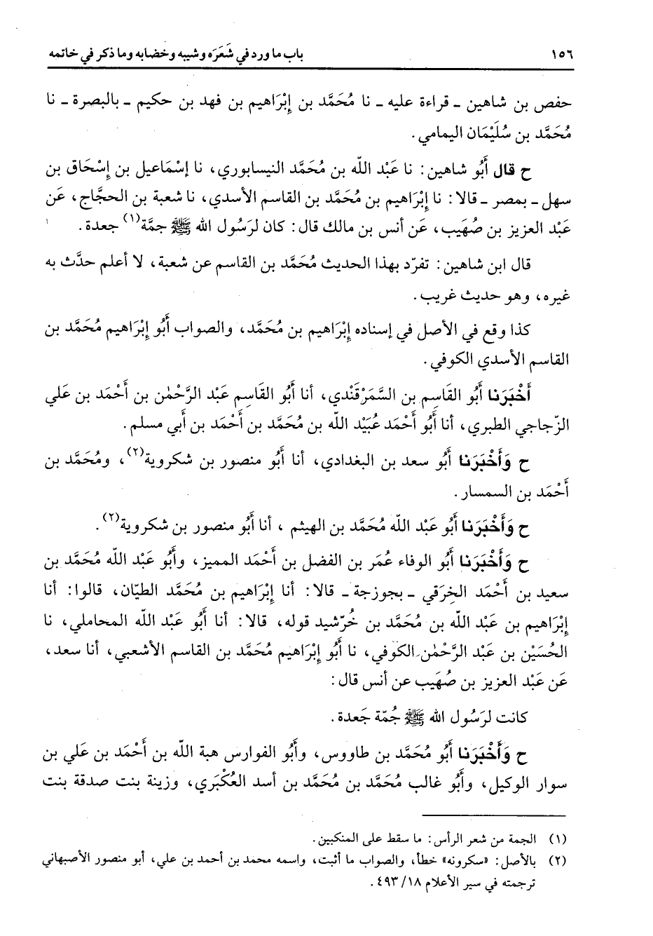 حفص بن شاهين قراءة عليه نا محمد بن إبراهيم بن فهد بن حكيم بالبصرة نا محمد بن سليمان اليمامي ح قال أبو شاهين نا عبد الله بن محمد بن النيسابوري نا اسماعيل بن اسحاق بن سهل بمصر قالا نا ابراهيم بن محمد بن القاسم الأسدي نا شعبة بن الحجاج عن عبد العزيز بن صهيب عن أنس بن مالك قال كان لرسول الله (صلى الله عليه وسلم) جمة (1) جعدة قال ابن شاهين تفرد بهذا الحديث محمد بن القاسم عن شعبة لا أعلم حدث به غيره وهو حديث غريب كذا وقع في الأصل في إسناده إبراهيم بن محمد والصواب أبو إبراهيم محمد بن القاسم الأسدي الكوفي أخبرنا أبو القاسم بن السمرقندي أنا أبو القاسم عبد الرحمن بن أحمد بن علي الزجاجي الطبري أنا أبو أحمد عبيد الله بن محمد بن أحمد بن أبي مسلم ح وأخبرنا أبو سعد بن البغدادي أنا أبو منصور بن شكروية (2) ومحمد بن أحمد بن السمسار ح وأخبرنا أبو عبد الله محمد بن الهيثم أنا أبو منصور بن شكروية (2) ح وأخبرنا أبو الوفاء عمر بن الفضل بن أحمد المميز وأبو عبد الله محمد بن سعيد بن أحمد الخرقي بجوزجة قالا أنا إبراهيم بن محمد الطيان قالوا أنا إبراهيم بن عبد الله بن محمد بن خرشيد قوله قالا أنا أبو عبد الله المحاملي نا الحسين بن عبد الرحمن الكوفي نا أبو إبراهيم محمد بن القاسم الأشعبي أنا سعد عن عبد العزيز بن صهيب عن أنس قال كانت لرسول الله (صلى الله عليه وسلم) جمة جعدة ح وأخبرنا أبو محمد بن طاووس وأبو الفوارس هبة الله بن أحمد بن علي بن سوار الوكيل وأبو غالب محمد بن محمد بن أسد العكبري وزينة بنت صدقة بنت