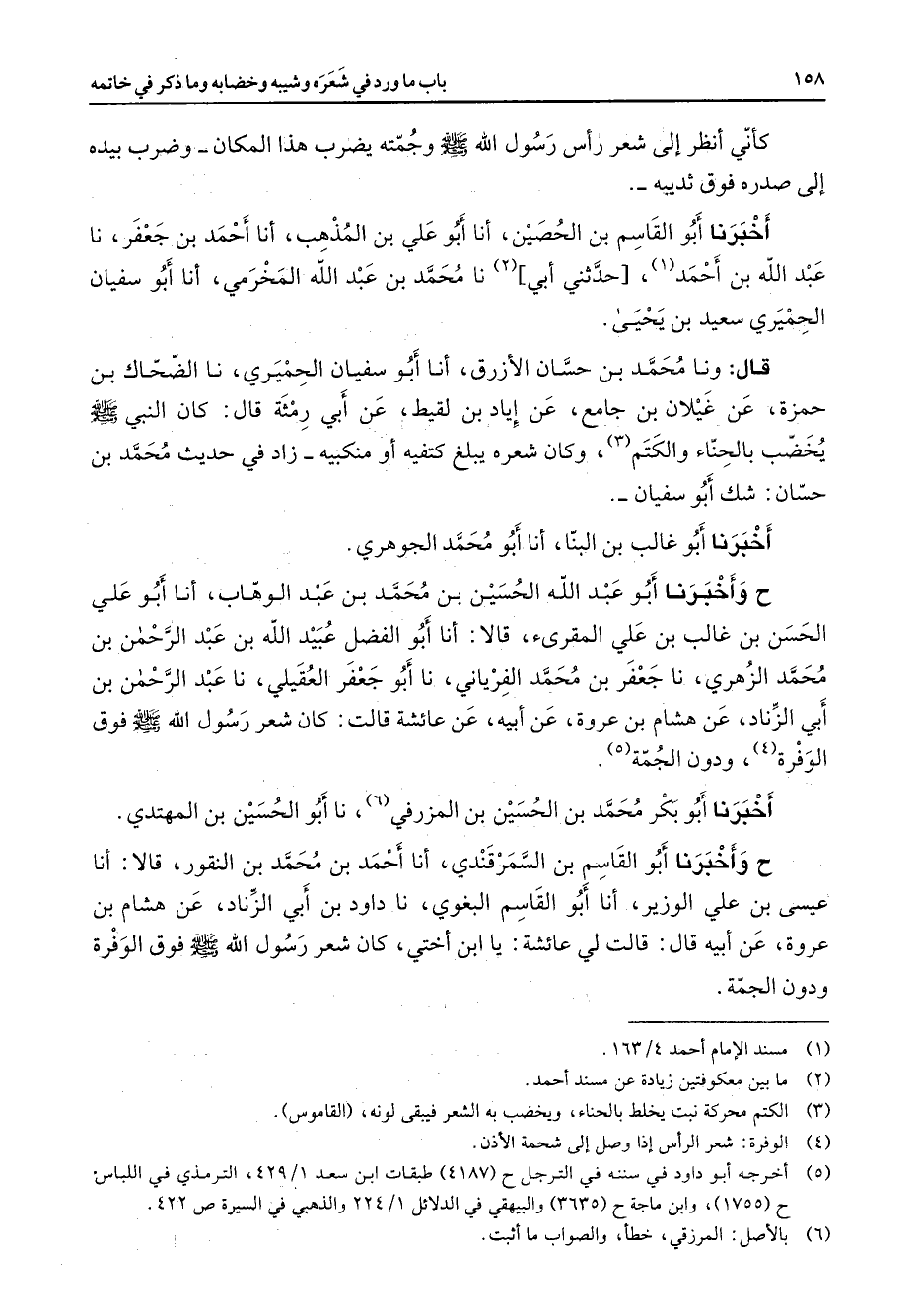 كأني أنظر إلى شعر رأس رسول الله (صلى الله عليه وسلم) وجمته يضرب هذا المكان وضرب بيده إلى صدره فوق ثديبه أخبرنا أبو القاسم بن الحصين أنا أبو علي بن المذهب أنا أحمد بن جعفر نا عبد الله بن أحمد (1) حدثني أبي (2) نا محمد بن عبد الله المخرمي أنا أبو سفيان الحميري سعيد بن يحيى قال ونا محمد بن حسان الأزرق أنا أبو سفيان الحميري نا الضحاك بن حمزة عن غيلان بن جامع عن إياد بن لقيط عن أبي رمثة قال كان النبي (صلى الله عليه وسلم) يخضب بالحناء والكتم (3) وكان شعره يبلغ كتفيه أو منكبيه زاد في حديث محمد بن حسان شك أبو سفيان أخبرنا أبو غالب بن البنا أنا أبو محمد الجوهري ح وأخبرنا أبو عبد الله الحسين بن محمد بن عبد الوهاب أنا أبو علي الحسن بن غالب بن علي المقرئ قالا أنا أبو الفضل عبيد الله بن عبد الرحمن بن محمد الزهري نا جعفر بن محمد الفرياني نا أبو جعفر العقيلي نا عبد الرحمن بن أبي الزناد عن هشام بن عروة عن أبيه عن عائشة قالت كان شعر رسول الله (صلى الله عليه وسلم) فوق الوفرة (4) ودون الجمة (5) أخبرنا أبو بكر محمد بن الحسين بن المزرفي (6) نا أبو الحسين بن المهتدي ح وأخبرنا أبو القاسم بن السمرقندي أنا أحمد بن محمد بن النقور قالا أنا عيسى بن علي الوزير أنا أبو القاسم البغوي نا داود بن أبي الزناد عن هشام بن عروة عن أبيه قال قالت لي عائشة يا ابن أختي كان شعر رسول الله (صلى الله عليه وسلم) فوق الوفرة ودون الجمة
