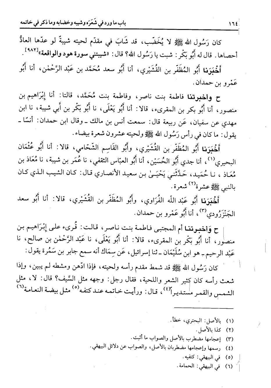 [982] أخبرنا أبو المظفر بن القشيري أنا أبو سعد محمد بن عبد الرحمن أنا أبو عمرو بن حمدان ح وأخبرتنا فاطمة بنت ناصر وفاطمة بنت محمد قالتا أنا إبراهيم بن منصور أنا أبو بكر بن المقرئ قالا أنا أبو يعلى نا أبو بكر بن أبي شيبة نا ابن مهدي عن سفيان عن ربيعة قال سمعت أنس بن مالك وقال ابن حمدان أنسا يقول ما كان في رأس رسول الله (صلى الله عليه وسلم) ولحيته عشرون شعرة بيضاء أخبرنا أبو المظفر بن القشيري وأبو القاسم الشحامي قالا أنا أبو عثمان البحيري (1) أنا جدي أبو الحسين أنا أبو العباس الثقفي نا عمر بن شيبة نا معاذ بن معاذ نا حميد حدثني يحيى بن سعيد الأنصاري قال كان الشيب الذي كان بالنبي (صلى الله عليه وسلم) عشرة (2) شعرة أخبرنا أبو عبد الله الفراوي وأبو المظفر بن القشيري قالا أنا أبو سعد الجنزرودي (3) أنا أبو عمرو بن حمدان ح وأخبرتنا أم المجتبى فاطمة بنت ناصر قالت قرئ على إبراهيم بن منصور أنا أبو بكر بن المقرئ قالا أنا أبو يعلى نا عبد الرحمن بن صالح نا عبد الرحيم هو ابن سليمان ثنا إسرائيل عن سماك أنه سمع جابر بن سمرة يقول كان رسول الله (صلى الله عليه وسلم) قد شمط مقدم رأسه ولحيته فإذا ادهن ومشطه لم يبين وإذا شعث رأسه كان كثير الشعر واللحية فقال رجل وجهه مثل السيف قال لا مثل الشمس والقمر مستديرا (4) قال ورأيت خاتمة عند كتفه (5) مثل بيضة النعامة (6)