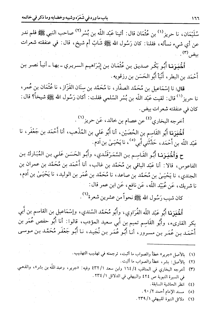 سليمان نا حريز (1) بن عثمان قال أتينا عبد الله بن بسر (2) صاحب النبي (صلى الله عليه وسلم) فلم ندر عن أي شئ نسأله فقلنا كان رسول الله (صلى الله عليه وسلم) شاب أم شيخ قال في عنفقته شعرات بيض (3) أخبرنا أبو بكر صديق بن عثمان بن إبراهيم السريري بها أنبأ نصر بن أحمد بن البطر أنبأ أبو الحسن بن رزقويه قال نا إسماعيل بن محمد الصفار نا محمد بن سنان القزاز نا عثمان بن عمر نا حريز (1) قال لقيت عبد الله بن بسر السلمي فقلت أكان رسول الله (صلى الله عليه وسلم) شيخا قال كان في عنفقته شعرات بيض أخرجه البخاري (4) عن عصام بن خالد عن حريز (1) أخبرنا أبو القاسم بن الحصين أنا أبو علي بن المذهب أنا أحمد بن جعفر نا عبد الله بن أحمد حدثني أبي (5) نا يحيى بن آدم ح وأخبرنا أبو القاسم بن السمرقندي وأبو الحسن علي بن المبارك بن الفاعوس قالا أنا عبد الباقي بن محمد بن غالب أنا أحمد بن محمد بن عمران بن الجندي نا يحيى بن محمد بن صاعد نا محمد بن عمر بن الوليد نا يحيى بن آدم نا شريك عن عبيد الله عن نافع عن ابن عمر قال كان شيب رسول الله (صلى الله عليه وسلم) نحوا من عشرين شعرة (6) أخبرنا أبو عبد الله الفراوي وأبو محمد السندي وإسماعيل بن القاسم بن أبي بكر القارئ وأبو القاسم تميم بن أبي سعيد المؤدب قالوا أنا أبو حفص عمر بن أحمد بن عمر بن مسرور أنا أبو عمر بن نجيد نا أبو جعفر محمد بن موسى