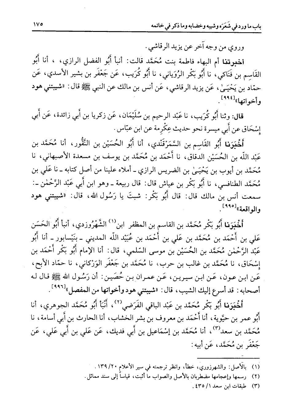 [995] أخبرنا أبو بكر محمد بن القاسم بن المظفر ابن (1) الشهروزدي أنبأ أبو الحسن علي بن أحمد بن محمد بن علي بن أحمد بن عبيد الله المديني بنيسابور أنا أبو عبد الرحمن محمد بن الحسين بن موسى السلمي قال أنا الإمام أبو بكر أحمد بن إسحاق نا محمد بن غالب بن حرب نا محمد بن جعفر الوركاني نا حماد الأبح عن ابن عون عن ابن سيرين عن عمران بن حصين أن رسول الله (صلى الله عليه وسلم) قال له أصحابه قد أسرع إليك الشيب قال شيبتني هود وأخواتها من المفصل