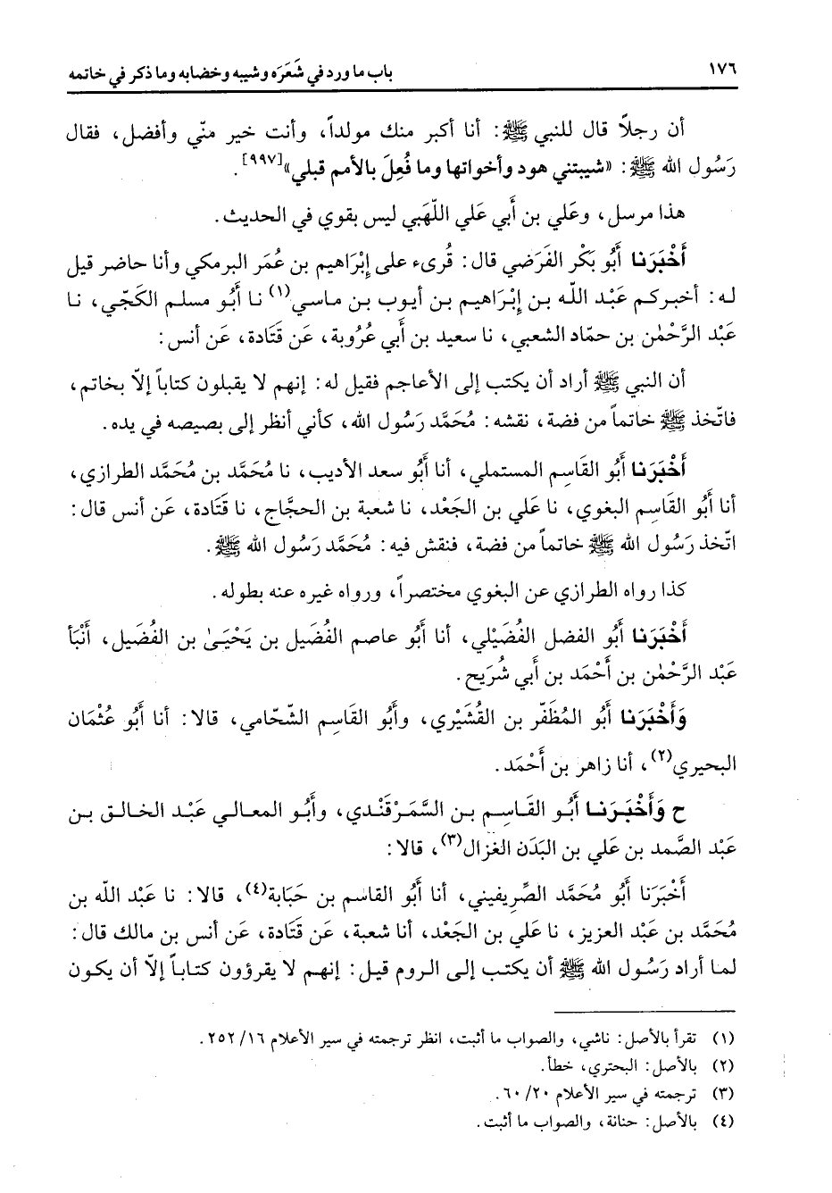 [997] هذا مرسل وعلي بن أبي علي اللهبي ليس بقوي في الحديث أخبرنا أبو بكر الفرضي قال قرئ على إبراهيم البرمكي وأنا حاضر قيل له أخبركم عبد الله بن إبراهيم بن أيوب بن ماسي (1) نا أبو مسلم الكجي نا عبد الرحمن بن حماد الشعبي نا سعيد بن أبي عروبة عن قتادة عن أنس أن النبي (صلى الله عليه وسلم) أراد أن يكتب الأعاجم فقيل له إنهم لا يقبلون كتابا إلا بخاتم فاتخذ (صلى الله عليه وسلم) خاتما من فضة نقشة محمد رسول الله كأني أنظر إلى بصيصة في يده أخبرنا أبو القاسم المستملي أنا أبو سعد الأديب نا محمد بن محمد الطرازي أنا أبو القاسم البغوي نا علي بن الجعد نا شعبة بن الحجاج نا قتادة عن أنس قال اتخذ رسول الله (صلى الله عليه وسلم) خاتمتا من فضة فنقش فيه محمد رسول الله (صلى الله عليه وسلم) كذا رواه الطرازي عن البغوي مختصرا ورواه غيره عن بطوله أخبرنا أبو الفضل الفضيلي أنا أبو عاصم الفضيل بن يحيى بن الفضيل أنبأ عبد الرحمن بن احمد بن أبي شريح وأخبرنا أبو المظفر بن القشيري وأبو القاسم الشحامي قالا أنا أبو عثمان البحيري (2) أنا زاهر بن أحمد ح وأخبرنا أبو القاسم السمرقندي وأبو المعالي عبد الخالق بن عبد الصمد بن علي بن البدن الغزال (3) قالا أخبرنا أبو محمد الصريفيني أنا أبو القاسم بن حبابة (4) قالا نا عبد الله بن محمد بن عبد العزيز نا علي بن الجعد أنا شعبة عن قتادة عن أنس بن مالك قال لما أراد رسول الله (صلى الله عليه وسلم) أن يكتب إلى الروم قيل إنهم لا يقرؤون كتابا إلا أن يكون