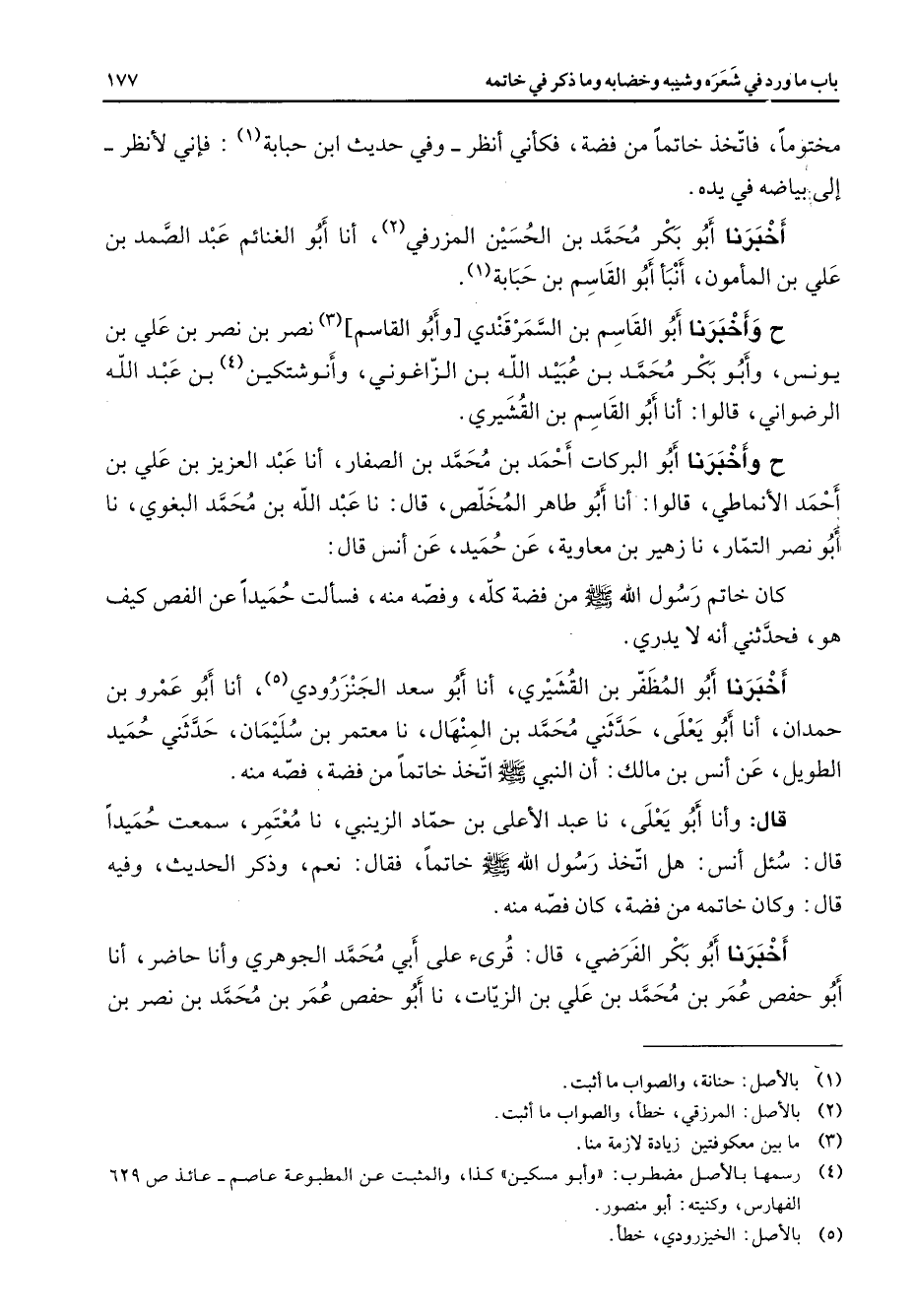 مختوما فاتخذ خاتما من فضة فكأني انظر وفي حديث ابن حبابة (1) فإني لأنظر إلى بياضه في يده أخبرنا أبو بكر محمد بن الحسين المزرفي (2) أنا أبو الغنائم عبد الصمد بن علي بن المأمون أنبأ أبو القاسم بن حبابة (1) ح وأخبرنا أبو القاسم بن السمرقندي وأبو القاسم (3) نصر بن نصر بن علي بن يونس وأبو بكر محمد بن عبيد الله بن الزاغوني وأنوشتكين (4) بن عبد الله الرضواني قالوا أنا أبو القاسم بن القشيري ح وأخبرنا أبو البركات أحمد بن محمد بن الصفار أنا عبد العزيز بن علي بن أحمد الأنماطي قالوا أنا أبو طاهر المخلص قال نا عبد الله بن محمد البغوي نا أبو نصر التمار نا زهير بن معاوية عن حميد عن أنس قال كان خاتم رسول الله (صلى الله عليه وسلم) من فضة كله وفصه منه فسألت حميدا عن الفص كيف هو فحدثني أنه لا يدري أخبرنا أبو المظفر بن القشيري أنا أبو سعد الجنزرودي (5) أنا أبو عمرو بن حمدان أنا أبو يعلى حدثني محمد بن المنهال نا معتمر بن سليمان حدثني حميد الطويل عن انس بن مالك أن النبي (صلى الله عليه وسلم) اتخذ خاتما من فضة فصه منه قال وأنا يعلى نا عبد الأعلى بن حماد الزينبي نا معتمر سمعت حميدا قال سئل أنس هل اتخذ رسول الله (صلى الله عليه وسلم) خاتما فقال نعم وذكر الحديث وفيه قال وكان خاتمه من فضة كان فصه منه أخبرنا أبو بكر الفرضي قال قرئ على أبي محمد الجوهري وأنا حاضر أنا أبو حفص عمر بن محمد بن علي بن الزيات نا أبو حفص عمر بن محمد بن نصر بن