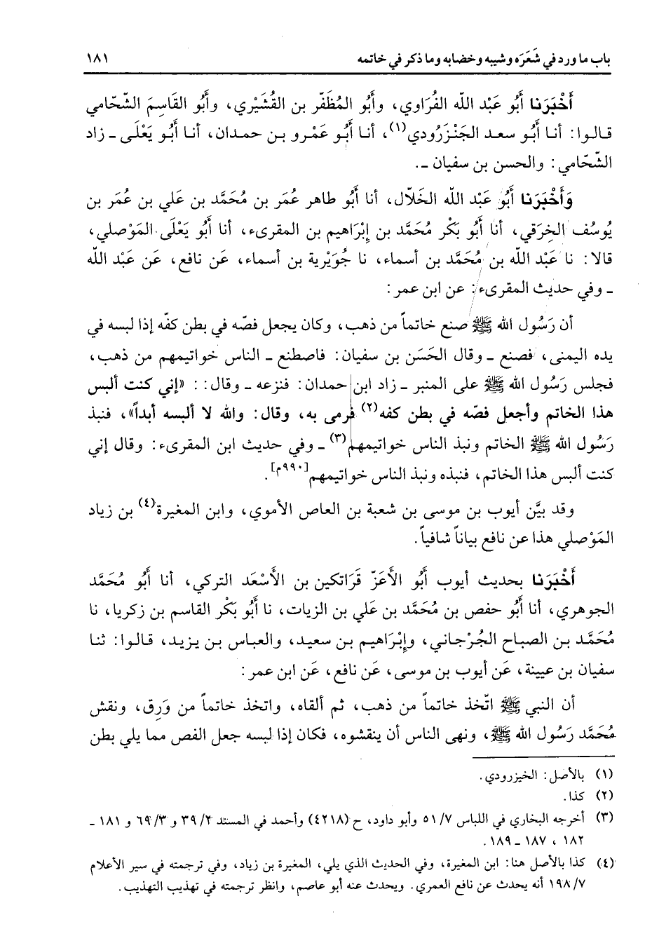 [990] وقد بين أيوب بن موسى بن شعبة بن العاص الأموي وابن المغيرة (4) بن زياد الموصلي هذا عن نافع بيانا شافيا أخبرنا بحديث أيوب أبو الأعز قراتكين بن الأسعد التركي أنا أبو محمد الجوهري أنا أبو حفص بن محمد بن علي بن الزيات نا أبو بكر القاسم بن زكريا نا محمد بن الصباح الجرجاني وإبراهيم بن سعيد والعباس بن يزيد قالوا ثنا سفيان بن عيينة عن أيوب بن موسى عن نافع عن ابن عمر أن النبي (صلى الله عليه وسلم) اتخذ خاتما من ذهب ثم ألقاه واتخذ خاتما من ورق ونقش محمد رسول الله (صلى الله عليه وسلم) ونهى الناس أن ينقشوه فكان إذا لبسه جعل الفص مما يلي بطن