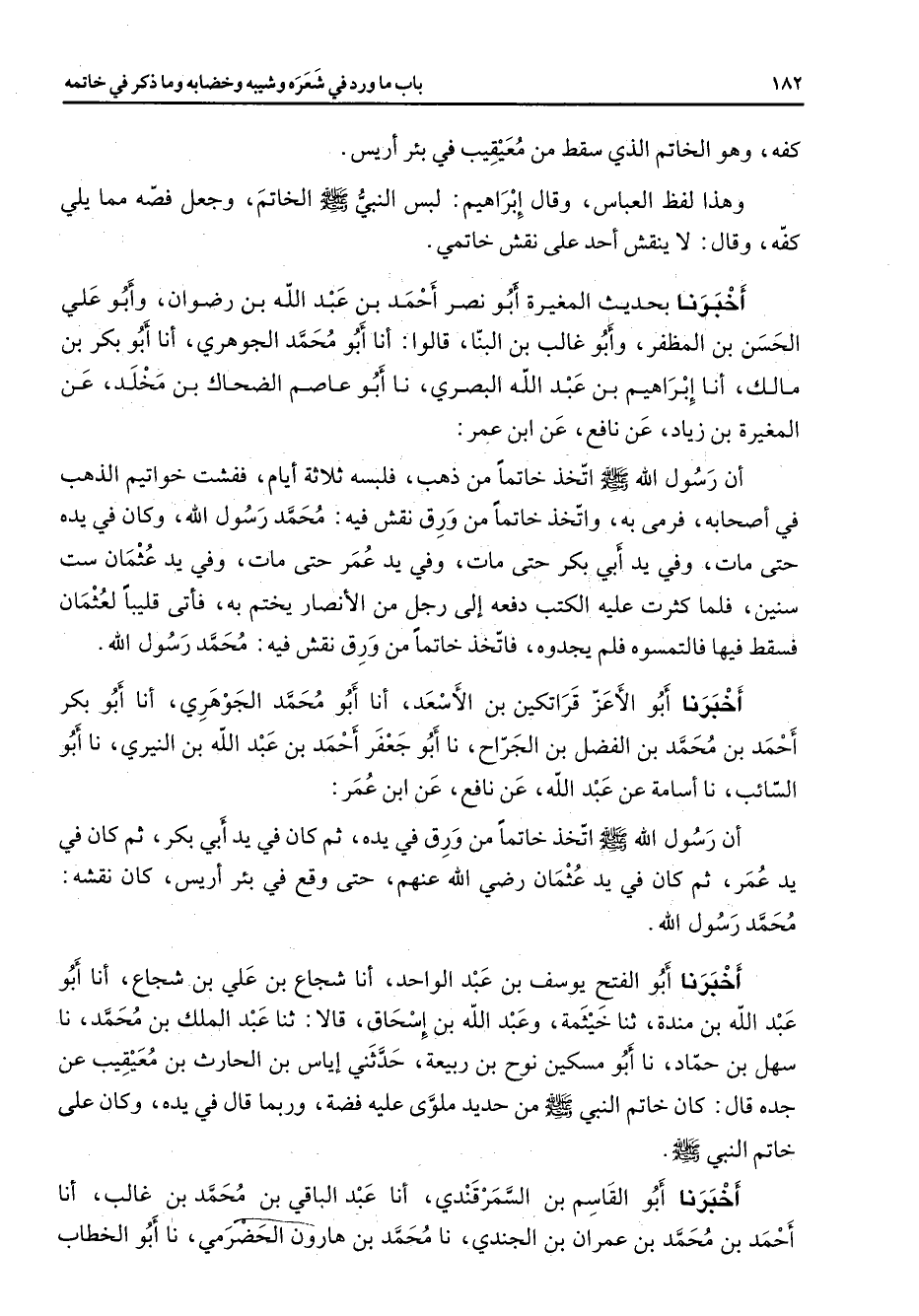 كفه وهو الخاتم الذي سقط من معيقيب في بئر أريس وهذا لفظ العباس وقال إبراهيم لبس النبي (صلى الله عليه وسلم) الخاتم وجعل فصه مما يلي كفه وقال لا نيقش أحد على نقش خاتمي أخبرنا بحديث المغيرة أبو نصر أحمد بن عبد الله بن رضوان وأبو علي الحسن بن المظفر وأبو غالب بن البنا قالوا أنا أبو محمد الجوهري أنا أبو بكر بن مالك أنا إبراهيم بن عبد الله البصري نا أبو عاصم الضحاك بن مخلد عن المغيرة بن زياد عن نافع عن ابن عمر أن رسول الله (صلى الله عليه وسلم) اتخذ خاتما من ذهب فلبسه ثلاثة أيام ففشت خواتيم الذهب في أصحابه فرمى به واتخذ خاتما من ورق نقش فيه محمد رسول الله وكان في يده حتى مات وفي يد أبي بكر حتى مات وفي يد عمر حتى مات وفي يد عثمان ست سنين فلما كثرت عليه الكتب دفعه إلى رجل من الأنصار يختم به فأتى قليبا لعثمان فسقط فيها فالتمسوه فلم يجدوه فاتخذ خاتما من ورق نقش فيه محمد رسول الله أخبرنا أبو الأعز قراتكين بن الأسعد أنا أبو محمد الجوهري أنا أبو بكر احمد بن محمد بن الفضل بن الجراح نا أبو جعفر أحمد بن عبد الله بن النيري نا أبو السائب نا أسامة عن عبد الله عن نافع عن ابن عمر أن رسول الله (صلى الله عليه وسلم) اتخذ خاتما من ورق في يده ثم كان في يد أبي بكر ثم كان في يد عمر ثم كان في يد عثمان Bهم حتى وقع في بئر أريس كان نقشه محمد رسول الله أخبرنا أبو الفتح يوسف بن عبد الواحد أنا شجاع بن علي بن شجاع أنا أبو عبد الله بن مندة ثنا خيثمة وعبد الله بن إسحاق قالا ثنا عبد الملك بن محمد نا سهل بن حماد نا أبو مسكين نوح بن ربيعة حدثني إياس بن الحارث بن معيقيب عن جده قال كان خاتم النبي (صلى الله عليه وسلم) من حديد ملوى عليه فضة وربما قال في يده وكان علي خاتم النبي (صلى الله عليه وسلم) أخبرنا أبو القاسم بن السمرقندي أنا عبد الباقي بن محمد بن غالب أنا أحمد بن محمد بن عمران بن الجندي نا محمد بن هارون الحضرمي نا أبو الخطاب