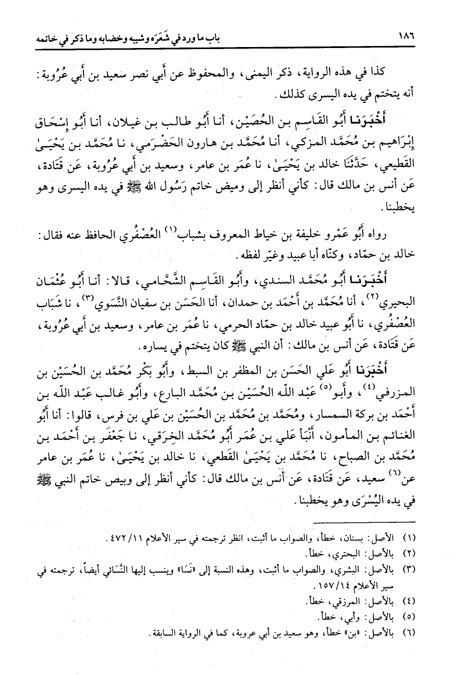 كذا في هذه الرواية ذكر اليمنى والمحفوظ عن أبي نصر سعيد بن أبي عروبة أنه يتختم في يده اليسرى كذلك أخبرنا أبو القاسم بن الحصين أنا أبو طالب بن غيلان أنا أبو إسحاق إبراهيم بن محمد المزكي أنا محمد بن هارون الحضرمي نا محمد بن يحيى القطيعي حدثنا خالد بن يحيى نا عمر بن عامر وسعيد بن أبي عروبة عن قتادة عن أنس بن مالك قال كأني أنظر إلى وميض خاتم رسول الله (صلى الله عليه وسلم) في يده اليسرى وهو يخطبنا رواه أبو عمرو خليفة بن خياط المعروف بشباب (1) العصفري الحافظ عنه فقال خالد بن حماد وكناه أبا عبيد وغير لفظه أخبرنا أبو محمد السندي وأبو القاسم الشحامي قالا أنا أبو عثمان البحيري (2) أنا محمد بن أحمد بن حمدان أنا الحسن بن سفيان النسوي (3) نا شباب العصفري نا أبو عبيد خالد بن حماد الحرمي نا عمر بن عامر وسعيد بن أبي عروبة عن قتادة عن أنس بن مالك أن النبي (صلى الله عليه وسلم) كان يتختم في يساره أخبرنا أبو علي الحسن بن المظفر بن السبط وأبو بكر محمد بن الحسين بن المزرفي (4) وأبو (5) عبد الله الحسين بن بن محمد البارع وأبو غالب عبد الله بن أحمد بن بركة السمسار ومحمد بن محمد بن الحسين بن علي بن فرس قالوا أنا أبو الغنائم بن المأمون أنبأ علي بن عمر أبو محمد الخرقي نا جعفر بن أحمد بن محمد بن الصباح نا محمد بن يحيى القطعي نا خالد بن يحيى نا عمر بن عامر عن (6) سعيد عن قتادة عن أنس بن مالك قال كأني أنظر إلى وبيص خاتم النبي (صلى الله عليه وسلم) في يده اليسرى وهو يخطبنا