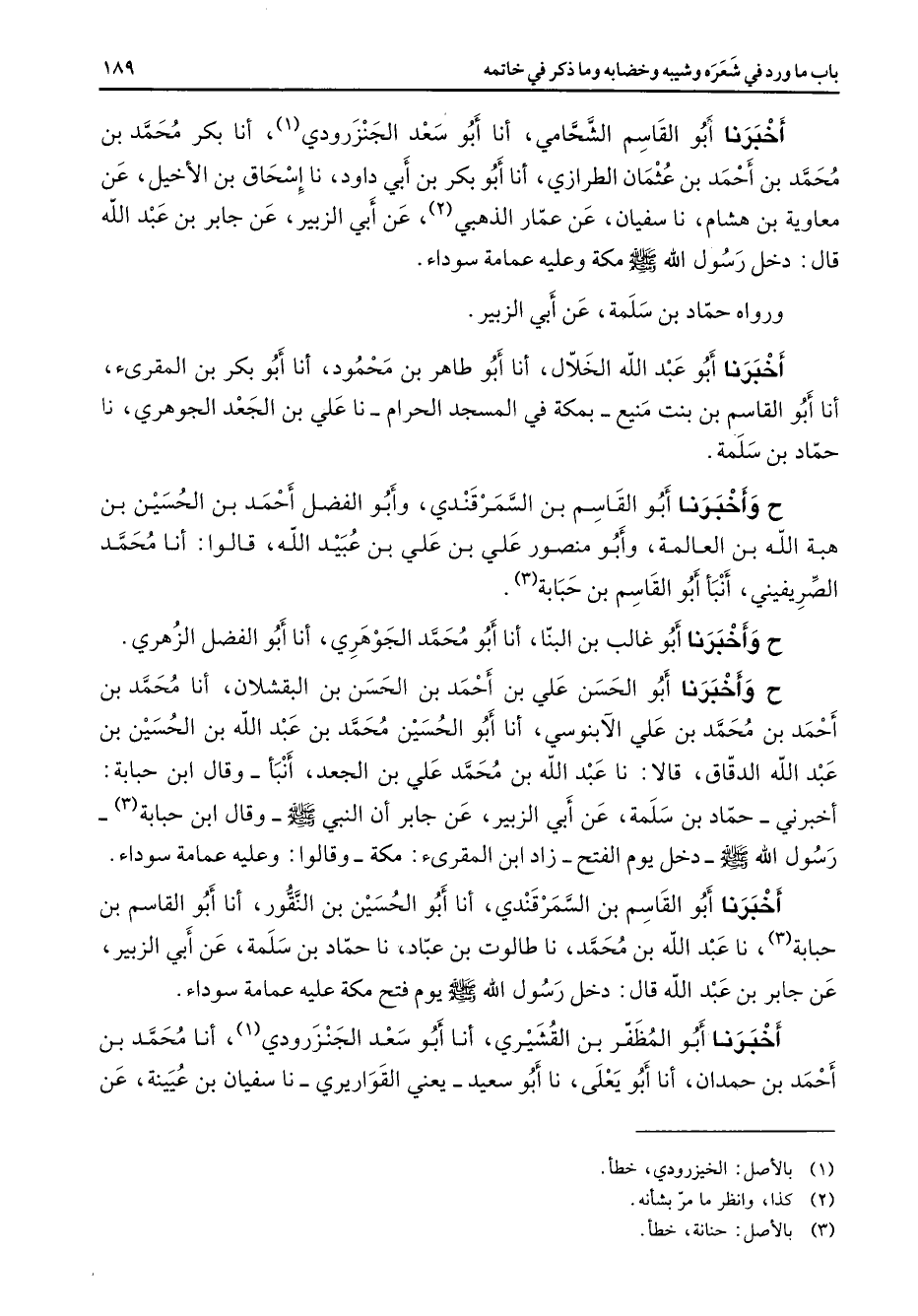 أخبرنا أبو القاسم الشحامي أنا أبو سعد الجنزرودي أنا بكر محمد بن محمد بن أحمد بن عثمان الطرازي أنا أبو بكر بن أبي داود نا إسحاق بن الأخيل عن معاوية بن هشام نا سفيان عن عمار الذهبي عن أبي الزبير عن جابر بن عبد الله قال دخل رسول الله (صلى الله عليه وسلم) مكة وعليه عمامة سوداء ورواه حماد بن سلمة عن أبي الزبير اخبرنا أبو عبد الله الخلال أنا أبو طاهر بن محمود أنا أبو بكر بن المقرئ أنا أبو القاسم بن بنت منيع بمكة في المسجد الحرام نا علي بن الجعد الجوهري نا حماد بن سلمة ح واخبرنا أبو القاسم بن السمرقندي وأبو الفضل أحمد بن الحسين بن هبة الله بن العالمة وأبو منصور علي بن علي بن عبيد الله قالوا أنا محمد الصريفيني أنبأ أبو القاسم بن حبابة (3) ح وأخبرنا أبو غالب بن البنا أنا أبو محمد الجوهري أنا أبو الفضل الزهري ح وأخبرنا أو الحسن علي بن أحمد بن الحسن بن البقشلان أنا محمد بن أحمد بن محمد بن علي الآبنوسي أنا أبو الحسين محمد بن عبد الله بن الحسين بن عبد الله الدقاق قالا نا عبد الله بن محمد علي بن الجعد أنبأ وقال ابن حبابة أخبرني حماد بن سلمة عن أبي الزبير عن جابر أن النبي (صلى الله عليه وسلم) وقال ابن حبابة (3) رسول الله (صلى الله عليه وسلم) دخل يوم الفتح زاد ابن المقرئ مكة وقالوا وعليه عمامة سوداء أخبرنا أبو القاسم بن السمرقندي أنا أبو الحسين بن النقور أنا أبو القاسم بن حبابة (3) نا عبد الله بن محمد نا طالوت بن عباد نا حماد بن سلمة عن أبي الزبير عن جابر بن عبد الله قال دخل رسول الله (صلى الله عليه وسلم) يوم فتح مكة عليه عمامة سوداء أخبرنا أبو المظفر بن القشيري أنا أبو سعد الجنزرودي (1) أنا محمد بن أحمد بن حمدان أنا أبو يعلى نا أبو سعيد يعني القواريري نا سفيان بن عيينة عن
