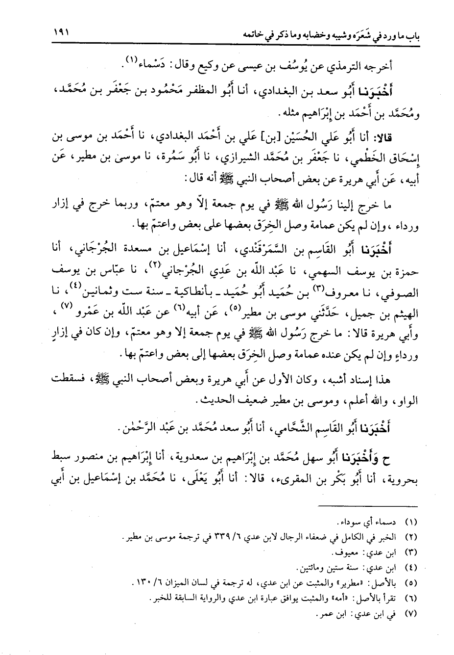 أخرجه الترمذي عن يوسف بن عيسى عن وكيع وقال دسماء (1) أخبرنا أبو سعد بن البغدادي أنا أبو المظفر محمود بن جعفر بن محمد ومحمد بن أحمد بن إبراهيم مثله قالا أنا أبو علي الحسين بن علي بن أحمد البغدادي نا أحمد بن موسى بن إسحاق الخطمي نا جعفر بن محمد الشيرازي نا أبو سمرة نا موسى بن مطير عن أبيه عن أبي هريرة عن بعض أصحاب النبي (صلى الله عليه وسلم) أنه قال ما خرج إلينا رسول الله (صلى الله عليه وسلم) في يوم جمعة إلا وهو معتم وربما خرج في إزار ورداء وإن لم يكن عمامة وصل الخرق بعضها على بعض واعتم بها أخبرنا أبو القاسم بن السمرقندي أنا إسماعيل بن مسعدة الجرجاني أنا حمزة بن يوسف السهمي نا عبد الله بن عدي الجرجاني (2) نا عباس بن يوسف الصوفي نا معروف (3) بن حميد أبو حميد بأنطاكية سنة ست وثمانين (4) نا الهيثم بن جميل حدثني موسى بن مطير (5) عن أبيه (6) عن عبد الله بن عمرو (7) وأبي هريرة قالا ما خرج رسول الله (صلى الله عليه وسلم) في يوم جمعة إلا وهو معتم وإن كان في إزار ورداء وإن لم يكن عنده عمامة وصل الخرق بعضها إلى بعض واعتم بها هذا إسناد أشبه وكان الأول عن أبي هريرة وبعض أصحاب النبي (صلى الله عليه وسلم) فسقطت الواو والله أعلم وموسى بن مطير ضعيف الحديث أخبرنا أبو القاسم الشحامي أنا أبو سعد محمد بن عبد الرحمن ح وأخبرنا أبو سهل محمد بن إبراهيم بن سعدوية أنا إبراهيم بن منصور سبط بحروية أنا أبو بكر بن المقرئ قالا أنا أبو يعلى نا محمد بن إسماعيل بن أبي