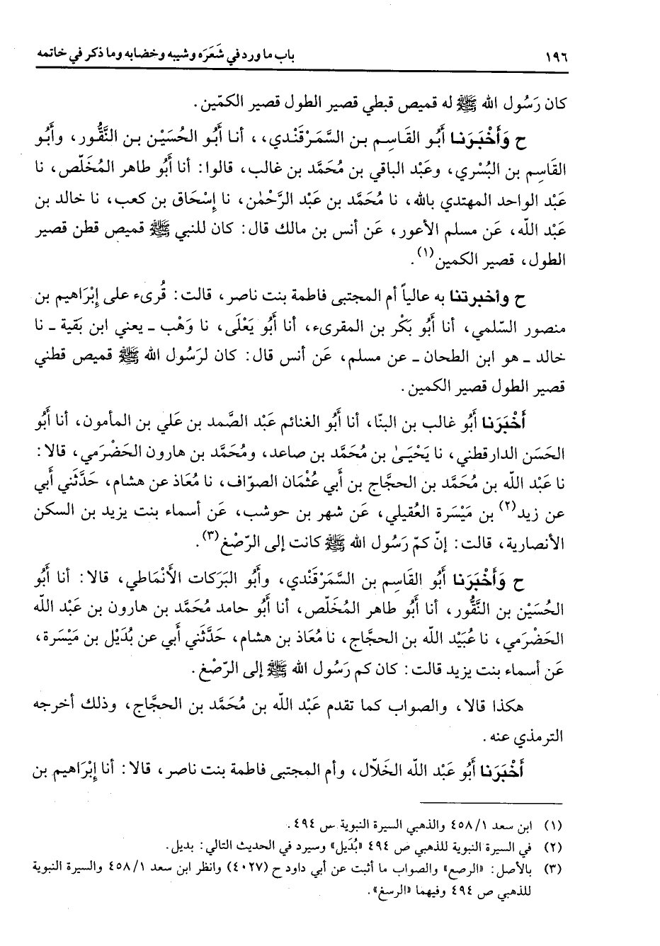 كان رسول الله (صلى الله عليه وسلم) له قميص قبطي قصير الطول قصير الكمين ح وأخبرنا أبو القاسم بن السمرقندي أنا أبو الحسين بن النقور وأبو القاسم بن البسري وعبد الباقي بن محمد بن غالب قالوا أنا أبو طاهر المخلص نا عبد الواحد المهتدي بالله نا محمد بن عبد الرحمن نا إسحاق بن كعب نا خالد بن عبد الله عن مسلم الأعور عن انس بن مالك قال كان للنبي (صلى الله عليه وسلم) قميص قطن قصير الطول قصير الكمين (1) ح وأخبرتنا به عاليا أم المجتبى فاطمة بنت ناصر قالت قرئ على إبراهيم بن منصور السلمي أنا أبو بكر بن المقرئ أنا أبو يعلى نا وهب يعني ابن بقية نا خالد هو ابن الطحان عن مسلم عن أنس قال كان لرسول الله (صلى الله عليه وسلم) قميص قطني قصير الطول قصير الكمين أخبرنا أبو غالب بن البنا أنا أبو الغنائم عبد الصمد بن علي بن المأمون أنا أبو الحسن الدارقطني نا يحيى بن محمد بن صاعد ومحمد بن هارون الحضرمي قالا نا عبد الله بن محمد بن الحجاج بن أبي عثمان الصواف نا معاذ عن هشام حدثني أبي عن زيد بن ميسرة العقيلي عن شهر بن حوشب عن أسماء بنت يزيد بن السكن الأنصارية قالت إن كم رسول الله (صلى الله عليه وسلم) كانت إلى الرصغ (3) ح وأخبرنا أبو القاسم بن السمرقندي وأبو البركات الأنماطي قالا أنا أبو الحسين بن النقور أنا أبو طاهر المخلص أنا أبو حامد محمد بن هارون بن عبد الله الحضرمي نا عبيد الله بن الحجاج نا معاذ بن هشام حدثني أبي عن بديل بن ميسرة عن أسماء بنت يزيد قالت كان كم رسول الله (صلى الله عليه وسلم) إلى الرصغ هكذا قالا والصواب كما تقدم عبد الله بن محمد بن الحجاج وذلك أخرجه الترمذي عنه أخبرنا أبو عبد الله الخلال وأم المجتبى فاطمة بنت ناصر قالا أنا إبراهيم بن