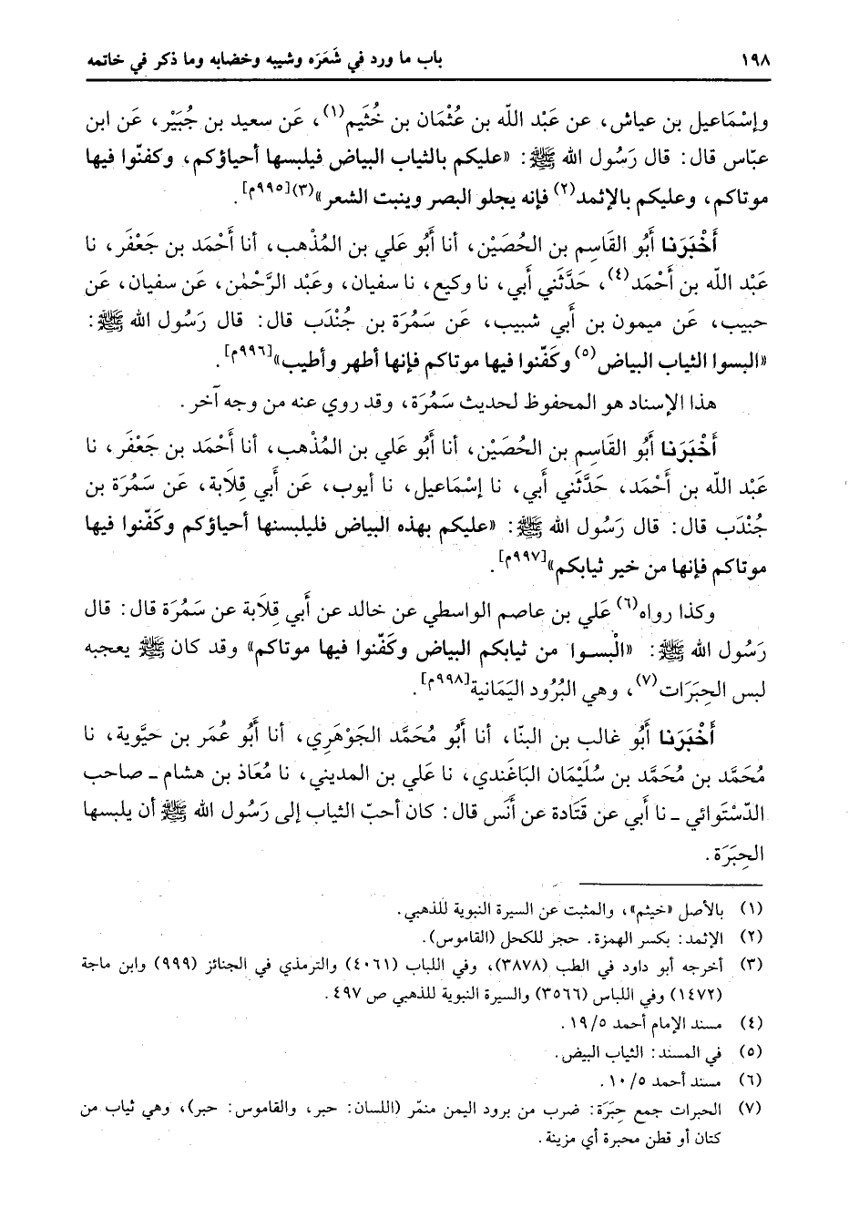(3) أخرجه أبو داود في الطب (3878) وفي اللباب (4061) والترمذي في الجنائز (999) وابن ماجة (1472) وفي اللباس (3566) والسيرة النبوية للذهبي ص 497