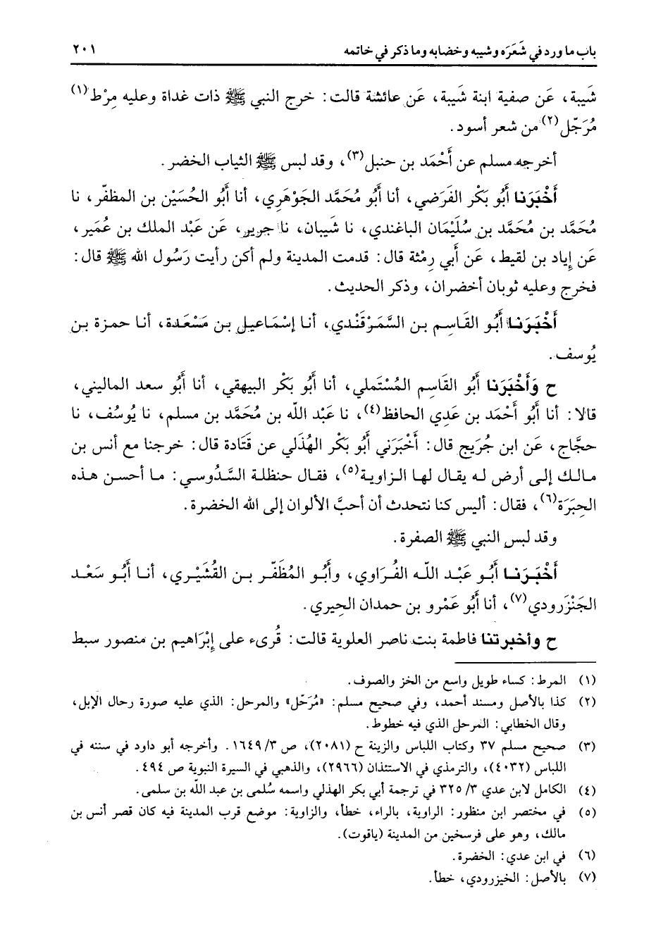 شيبة عن صفية ابنة شيبة عن عائشة قالت خرج النبي (صلى الله عليه وسلم) ذات غداة وعليه مرط (1) مرجل (2) من شعر أسود أخرجه مسلم عن أحمد بن حنبل (3) وقد لبس (صلى الله عليه وسلم) الثياب الخضر أخبرنا أبو بكر الفرضي أنا أبو محمد الجوهري أنا أبو الحسين بن المظفر نا محمد بن محمد بن سليمان الباغندي نا شيبان نا جرير عن عبد الملك بن عمير عن إياد بن لقيط عن أبي رمثه قال قدمت المدينة ولم أكن رأيت رسول الله (صلى الله عليه وسلم) قال فخرج وعليه ثوبان أخضران وذكر الحديث أخبرنا أبو القاسم بن السمرقندي أنا إسماعيل بن مسعدة أنا حمزة بن يوسف ح وأخبرنا أبو القاسم المستملي أنا أبو بكر البيهقي أنا أبو سعد الماليني قالا أنا أبو أحمد بن عدي الحافظ (4) نا عبد الله بن محمد بن مسلم نا يوسف نا حجاج عن ابن جريج قال أخبرني أبو بكر الهذلي عن قتادة قال خرجنا مع أنس بن مالك إلى أرض له يقال لها الزاوية (5) فقال حنظلة السدوسي ما أحسن هذه الحبرة (6) فقال أليس كنا نتحدث أن أحب الألوان إلى الله الخضرة وقد لبس النبي (صلى الله عليه وسلم) الصفرة أخبرنا أبو عبد الله الفراوي وأبو المظفر بن القشيري أنا أبو سعد الجنزرودي (7) أنا أبو عمرو بن حمدان الحيري ح وأخبرتنا فاطمة بنت ناصر العلوية قالت قرئ على إبراهيم بن منصور سبط