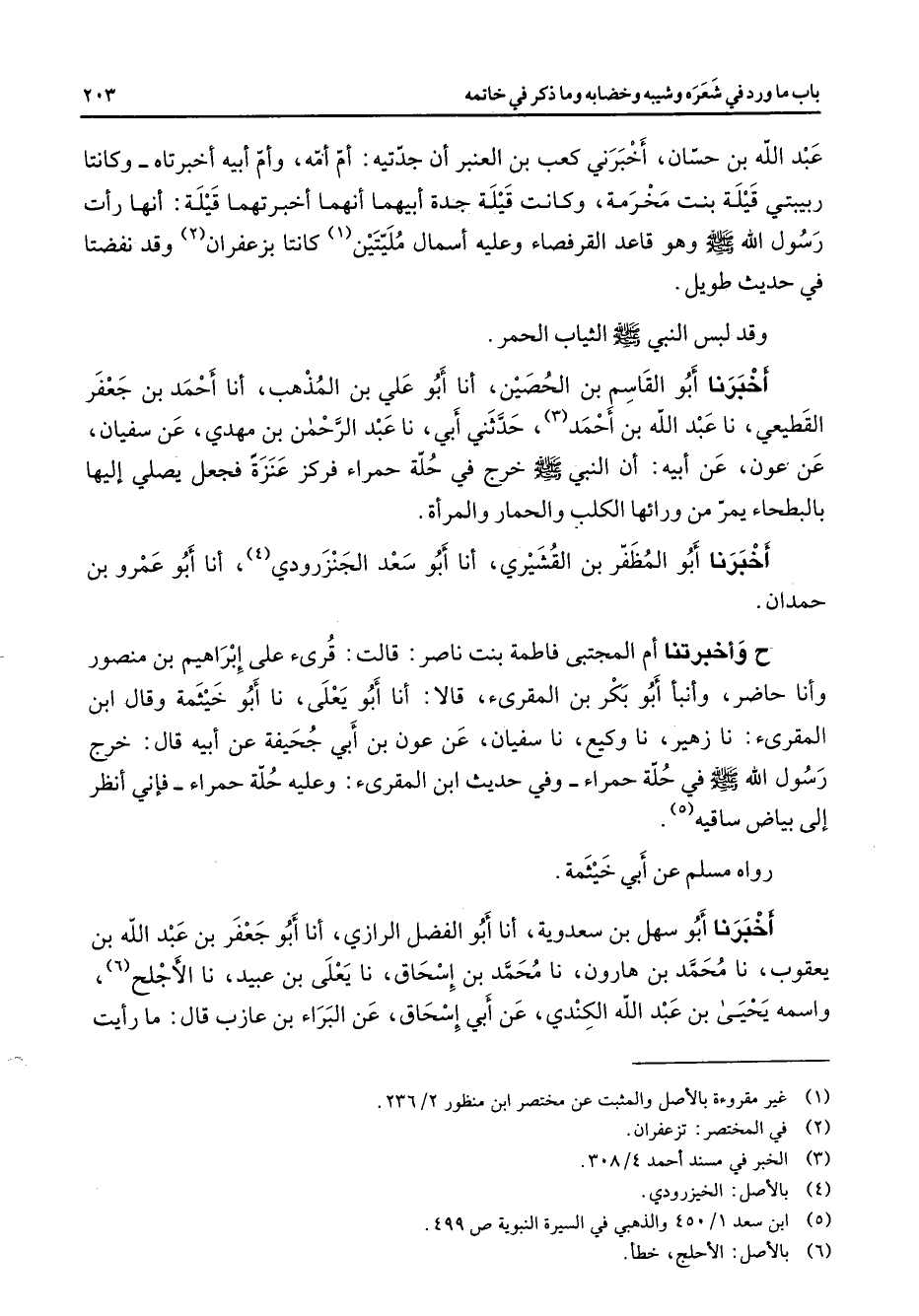 عبد الله بن حسان أخبرني كعب بن العنبر أن جدتيه أم أمه وأم أبيه أخبرتاه وكانتا ربيبتي قيلة بنت مخرمة وكانت قيلة جدة أبيهما أنهما أخبرتهما قيلة أنها رأت رسول الله (صلى الله عليه وسلم) وهو قاعد القرفصاء وعليه أسمال مليتين (1) كانتا بزعفران (2) وقد نفضتا في حديث طويل وقد لبس النبي (صلى الله عليه وسلم) الثياب الحمر أخبرنا أبو القاسم بن الحصين أنا أبو علي بن المذهب أنا أحمد بن جعفر القطيعي نا عبد الله بن أحمد حدثني أبي نا عبد الرحمن بن مهدي عن سفيان عن عون عن أبيه أن النبي (صلى الله عليه وسلم) خرج في حلة حمراء فركز عنزة فجعل يصلي إليها بالبطحاء يمر من ورائها الكلب والحمار والمرأة أخبرنا أبو المظفر بن القشيري أنا أبو سعد الجنزرودي أنا أبو عمرو بن حمدان ح وأخبرتنا أم المجتبى فاطمة بنت ناصر قالت قرئ على إبراهيم بن منصور وأنا حاضر وأنبأ أبو بكر بن المقرئ قالا أنا أبو يعلى نا أبو خيثمة وقال ابن المقرئ نا زهير نا وكيع نا سفيان عن عون بن أبي جحيفة عن أبيه قال خرج رسول الله (صلى الله عليه وسلم) في حلة حمراء وفي حديث ابن المقرئ وعليه حلة حمراء فإني أنظر إلى بياض ساقيه (5) رواه مسلم عن أبي خيثمة أخبرنا أبو سهل بن سعدوية أنا أبو الفضل الرازي أنا أبو جعفر بن عبد الله بن يعقوب نا محمد بن هارون نا محمد بن إسحاق نا يعلى بن عبيد نا الأجلح واسمه يحيى بن عبد الله الكندي عن أبي إسحاق عن البراء بن عازب قال ما رأيت