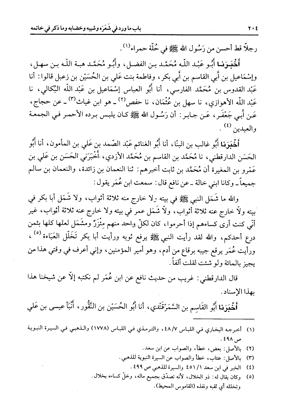 رجلا قط أحسن من رسول الله (صلى الله عليه وسلم) في حلة حمراء (1) أخبرنا أبو عبد الله محمد بن الفضل وأبو محمد هبة الله بن سهل وإسماعيل بن أبي القاسم بن أبي بكر وفاطمة بنت علي بن الحسين بن زعبل قالوا أنا عبد القدوس بن محمد الفارسي أنا أبو العباس إسماعيل بن عبد الله البكالي نا عبد الله الأهوازي نا سهل بن عثمان نا حفص (2) هو ابن غياث (3) عن حجاج عن أبي جعفر عن جابر أن رسول الله (صلى الله عليه وسلم) كان يلبس برده الأحمر في الجمعة والعيدين (4) أخبرنا أبو غالب بن البنا أنا أبو الغنائم عبد الصمد بن علي بن المأمون أنا أبو الحسن الدارقطني نا محمد بن القاسم بن محمد الأزدي أخبرني الحسن بن علي بن عمرو بن المغيرة أن محمد بن ثابت أخبرهم ثنا النعمان بن زائدة والنعمان بن سالم جميعا وكانا ابني خالة عن نافع قال سمعت ابن عمر يقول والله ما شمل النبي (صلى الله عليه وسلم) في بيته ولا خارج منه ثلاثة أثواب ولا شمل أبا بكر في بيته ولا خارج عنه ثلاث أثواب ولا شمل عمر في بيته ولا خارج عنه ثلاثة أثواب غير أني كنت أرى كساءهم إذا أحرموا كان لكل واحد منهم مئزر ومشمل لعلها كلها بثمن درع أحدكم والله لقد رأيت النبي (صلى الله عليه وسلم) يرفع ثوبه ورأيت أبا بكر تخلل العباءة (5) ورأيت عمر يرقع جيبه برقاع من أدم وهو أمير المؤمنين وإني أعرف في وقتي هذا من يجيز بالمائة ولو شئت لقلت ألفا قال الدارقطني غريب من حديث نافع عن ابن عمر لم نكتبه إلا عن شيخنا هذا بهذا الإسناد أخبرنا أبو القاسم بن السمرقندي أنا أبو الحسين بن النقور أنبأ عيسى بن علي