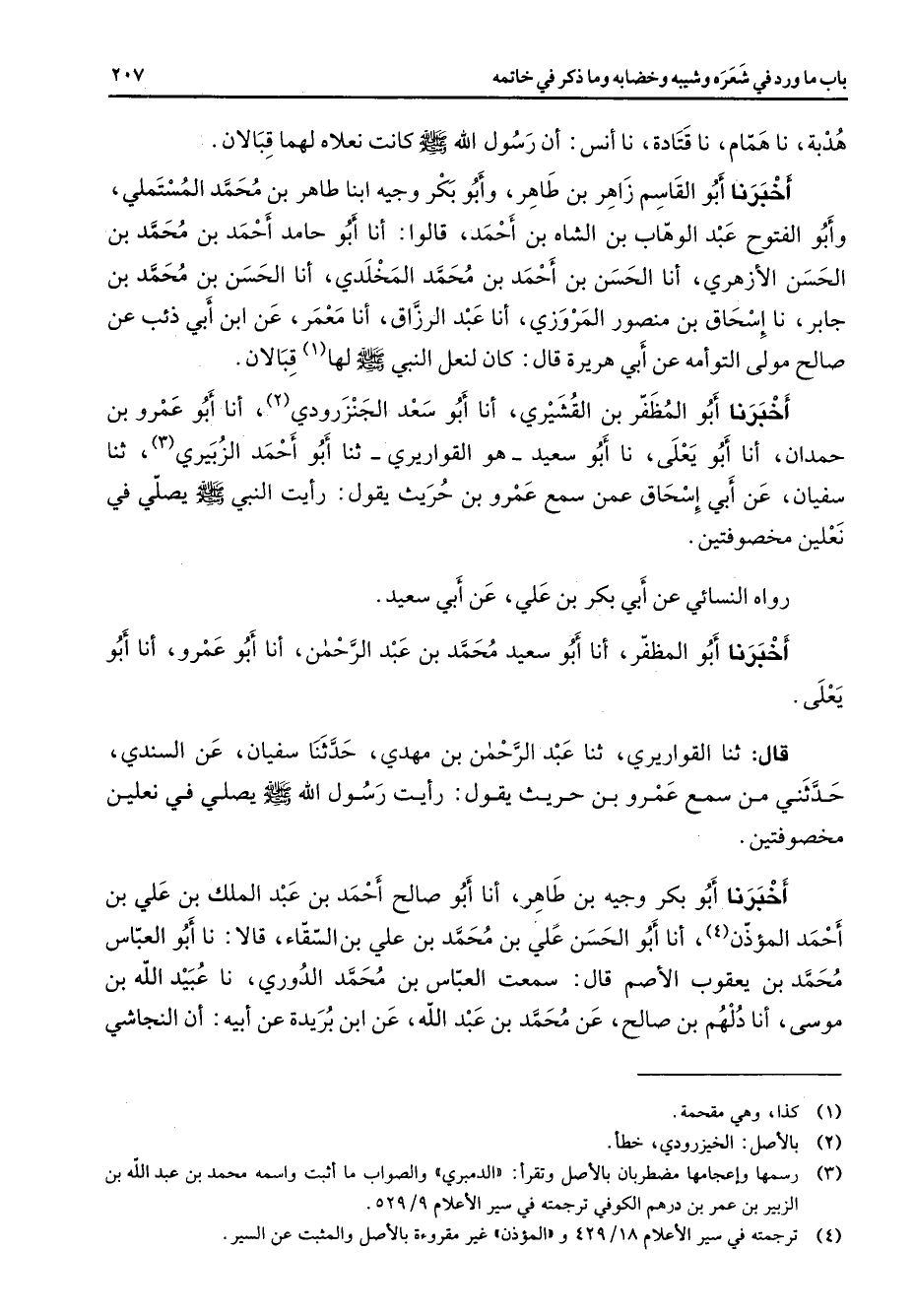 هدبة نا همام نا قتادة نا أنس أن رسول الله (صلى الله عليه وسلم) كانت نعلاه لهما قبالان أخبرنا أبو القاسم زاهر بن طاهر وأبو بكر وجيه ابنا طاهر بن محمد المستملي وأبو الفتوح عبد الوهاب بن الشاه بن أحمد قالوا أنا أبو حامد أحمد بن محمد بن الحسن الأزهري أنا الحسن بن أحمد بن محمد المخلدي أنا الحسن بن محمد بن جابر نا إسحاق بن منصور المروزي أنا عبد الرزاق أنا معمر عن ابن أبي ذئب عن صالح مولى التوأمه عن أبي هريرة قال كان لنعل النبي (صلى الله عليه وسلم) لها (1) قبالان أخبرنا أبو المظفر بن القشيري أنا أبو سعد الجنزرودي (2) أنا أبو عمرو بن حمدان أنا أبو يعلى نا أبو سعيد هو القواريري ثنا أبو أحمد الزبيري (3) ثنا سفيان عن أبي إسحاق عمن سمع عمرو بن حريث يقول رأيت النبي (صلى الله عليه وسلم) يصلي في نعلين مخصوفتين رواه النسائي عن أبي بكر بن علي عن أبي سعيد أخبرنا أبو المظفر أنا أبو سعيد محمد بن عبد الرحمن أنا أبو عمرو أنا أبو يعلى قال ثنا القواريري ثنا عبد الرحمن بن مهدي حدثنا سفيان عن السندي حدثني من سمع عمرو بن حريث يقول رأيت رسول الله (صلى الله عليه وسلم) يصلي في نعلين مخصوفتين أخبرنا أبو بكر وجيه بن طاهر أنا أبو صالح أحمد بن عبد الملك بن علي بن أحمد المؤذن (4) أنا أبو الحسن علي بن محمد بن علي بن السقاء قالا نا أبو العباس محمد بن يعقوب الأصم قال سمعت العباس بن محمد الدوري نا عبيد الله بن موسى أنا دلهم بن صالح عن محمد بن عبد الله عن ابن بريدة عن أبيه أن النجاشي