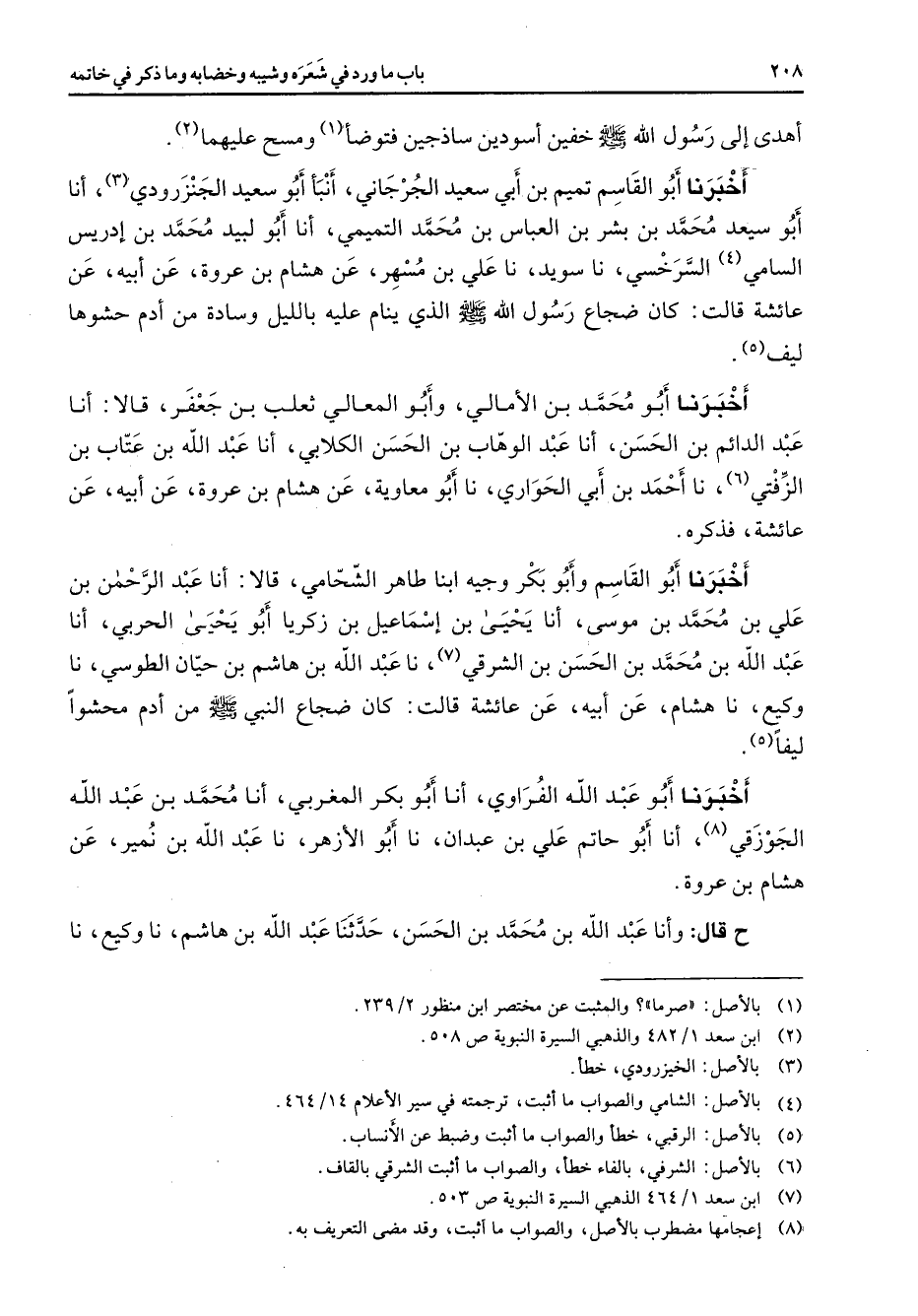 أهدي إلى رسول الله (صلى الله عليه وسلم) خفين أسودين ساذجين فتوضأ (1) ومسح عليهما (2) أخبرنا أبو القاسم تميم بن أبي سعيد الجرجاني أنبأ أبو سعيد الجنزرودي (3) أنا أبو سيعد محمد بن بشر بن العباس بن محمد التميمي أنا أبو لبيد محمد بن إدريس السامي (4) السرخسي نا سويد نا علي بن مسهر عن هشام بن عروة عن أبيه عن عائشة قالت كان ضجاع رسول الله (صلى الله عليه وسلم) الذي ينام عليه بالليل وسادة من أدم حشوها ليف (5) أخبرنا أبو محمد بن الأمالي وأبو المعالي ثعلب بن جعفر قالا أنا عبد الدائم بن الحسن أنا عبد الوهاب بن الحسن الكلابي أنا عبد الله بن عتاب بن الزفتي (6) نا أحمد بن أبي الحواري نا أبو معاوية عن هشام بن عروة عن أبيه عن عائشة فذكره أخبرنا أبو القاسم وأبو بكر وجيه ابنا طاهر الشحامي قالا أنا عبد الرحمن بن علي بن محمد بن موسى أنا يحيى بن إسماعيل بن زكريا أبو يحيى الحربي أنا عبد الله بن محمد بن الحسن بن الشرقي (7) نا عبد الله بن هاشم بن حيان الطوسي نا وكيع نا هشام عن أبيه عن عائشة قالت كان ضجاع النبي (صلى الله عليه وسلم) من أدم محشوا ليفا (5) أخبرنا أبو عبد الله الفراوي أنا أبو بكر المغربي أنا محمد بن عبد الله الجوزقي (8) أنا أبو حاتم علي بن عبدان نا أبو الأزهر نا عبد الله بن نمير عن هشام بن عروة ح قال وأنا عبد الله بن محمد بن الحسن حدثنا عبد الله بن هاشم نا وكيع نا