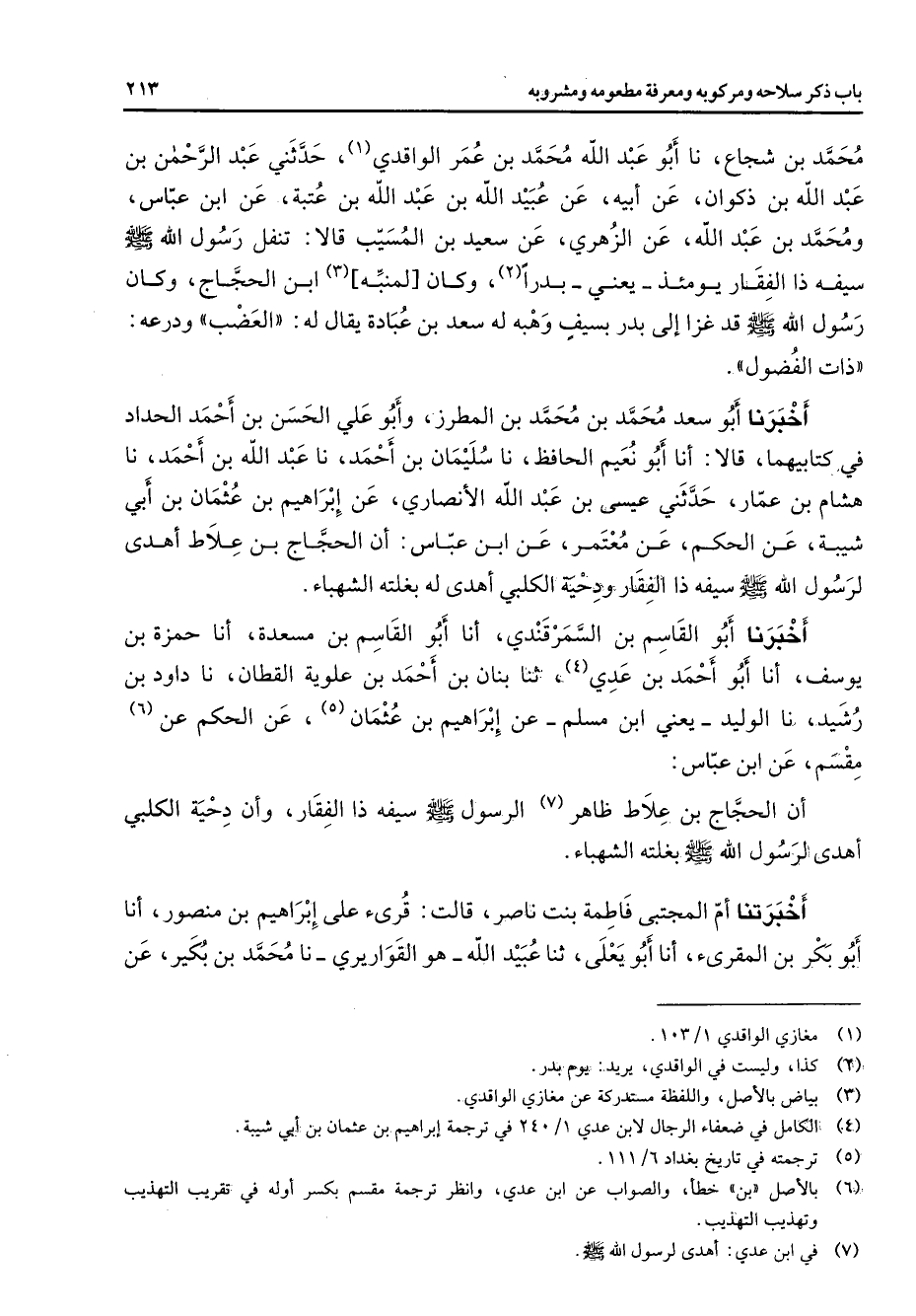 محمد بن شجاع نا أبو عبد الله محمد بن عمر الواقدي (1) حدثني عبد الرحمن بن عبد الله بن ذكوان عن أبيه عن عبيد الله بن عبد الله بن عتبة عن ابن عباس ومحمد بن عبد الله عن الزهري عن سعيد بن المسيب قالا تنفل رسول الله (صلى الله عليه وسلم) سفيه ذا الفقار يومئذ يعني بدرا (2) وكان لمنبه (3) ابن الحجاج وكان رسول الله (صلى الله عليه وسلم) قد غزا إلى بدر بسيف وهبه له سعد بن عبادة يقال له العضب ودرعه ذات الفضول أخبرنا أبو سعد محمد بن محمد بن المطرز وأبو علي الحسن بن أحمد الحداد في كتابيهما قالا أنا أبو نعيم الحافظ نا سليمان بن أحمد نا عبد الله بن أحمد نا هشام بن عمار حدثني عيسى بن عبد الله الأنصاري عن إبراهيم بن عثمان بن أبي شيبة عن الحكم عن معتمر عن ابن عباس أن الحجاج بن علاط أهدى لرسول الله سيفه ذا الفقار ودحية الكلبي أهدى له بغلته الشهباء أخبرنا أبو القاسم بن السمرقندي أنا أبو القاسم بن مسعدة أنا حمزة بن يوسف أنا أبو أحمد بن عدي (4) ثنا بنان بن أحمد بن علوية القطان نا داود بن رشيد نا الوليد يعني ابن مسلم عن إبراهيم بن عثمان (5) عن الحكم عن (6) مقسم عن ابن عباس أن الحجاج بن علاط ظاهر (7) الرسول سيفه ذا الفقار وأن دحيه الكلبي أهدى لرسول الله (صلى الله عليه وسلم) بغلته الشهباء أخبرتنا أم المجتبى فاطمة بنت ناصر قالت قرئ على إبراهيم بن منصور أنا أبو بكربن المقرئ أنا أبو يعلى ثنا عبيد الله هو القواريري نا محمد بن بكير عن
