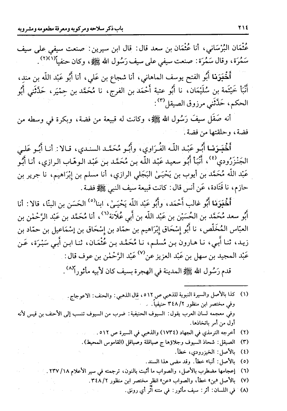 عثمان البرساني أنا عثمان بن سعد قال قال ابن سيرين صنعت سيفي على سيف سمرة وقال سمرة صنعت سيفي على سيف رسول الله (صلى الله عليه وسلم) وكان حنفيا (1) (2) أخبرنا أبو الفتح يوسف الماهاني أنا شجاع بن علي أنا أبو عبد الله بن مند أنبأ خيثمة بن سليمان نا أبو عتبة أحمد بن الفرج نا محمد بن حمير حدثني أبو الحكم حدثني مرزوق الصيقل (3) أنه صقل سيف رسول الله (صلى الله عليه وسلم) وكانت له قبيعة من فضة وبكرة في وسطه من فضة وحلقتها من فضة أخبرنا أبو عبد الله الفراوي وأبو محمد السندي قالا أنا أبو علي الجنزرودي (4) أنبأ أبو سعيد عبد الله بن محمد بن عبد الوهاب الرازي أنا أبو عبد الله محمد بن أيوب بن يحيى البجلي الرازي أنا مسلم بن إبراهيم نا جرير بن حازم نا قتادة عن أنس قال كانت قبيعة سيف النبي (صلى الله عليه وسلم) فضة أخبرنا أبو غالب أحمد وأبو عبد الله يحيى ابنا (5) الحسن بن البنا قالا أنا أبو سعد محمد بن الحسين بن عبد الله بن أبي علانة (6) أنا محمد بن عبد الرحمن بن العباس المخلص نا أبو إسحاق إبراهيم بن حماد بن إسحاق بن إسماعيل بن حماد بن زيد ثنا أبي نا هارون بن مسلم نا محمد بن عثمان ثنا ابن أبي سبرة عن عبد المجيد بن سهل بن عبد العزيز عن (7) عبد الرحمن بن عوف قال قدم رسول الله (صلى الله عليه وسلم) المدينة في الهجرة بسيف كان لأبيه مأثورا (8)