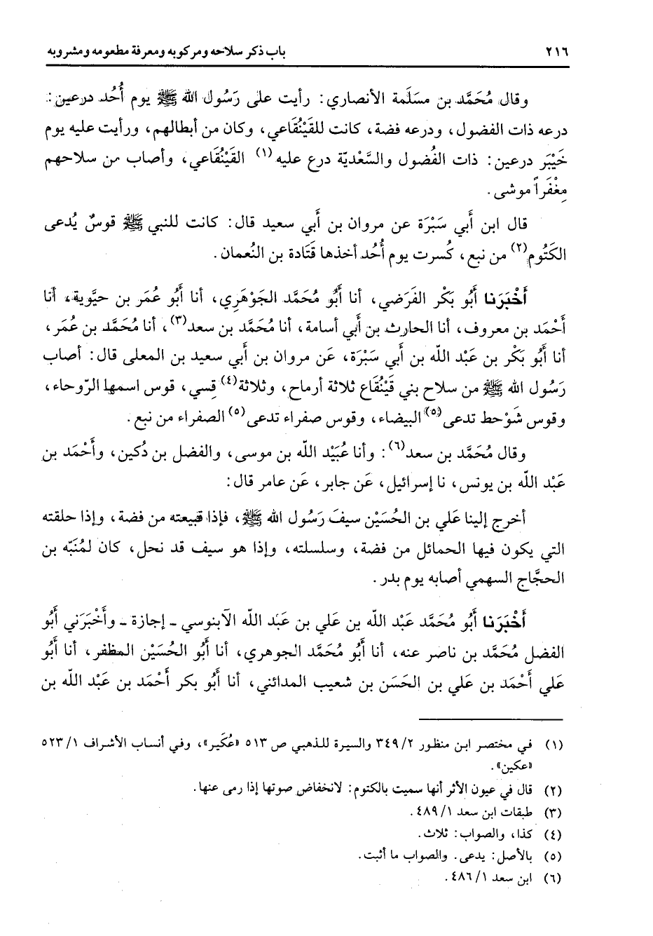 وقال محمد بن مسلمة الأنصاري رأيت على رسول الله (صلى الله عليه وسلم) يوم أحد درعين درعه ذات الفضول ودرعه فضة كانت للقينقاعي وكان من أبطالهم ورأيت عليه يوم خيبر درعين ذات الفضول والسعدية درع عليه (1) القينقاعي وأصاب من سلاحهم مغفرا موشى قال ابن أبي سبرة عن مروان بن أبي سعيد قال كانت للنبي (صلى الله عليه وسلم) قوس يدعى الكتوم (2) من نبع كسرت يوم أحد أخذها قتادة بن النعمان أخبرنا أبو بكر الفرضي أنا أبو محمد الجوهري أنا أبو عمر بن حيوية أنا أحمد بن معروف أنا الحارث بن أبي أسامة أنا محمد بن سعد (3) أنا محمد بن عمر أنا أبو بكر بن عبد الله بن أبي سبرة عن مروان بن أبي سعيد بن المعلى قال أصاب رسول الله (صلى الله عليه وسلم) من سلاح بني قينقاع ثلاثة (4) أرماح وثلاثة قسي قوس اسمها الروحاء وقوس شوحط تدعى (5) البيضاء وقوس صفراء تدعى (5) الصفراء من نبع وقال محمد بن سعد (6) وأنا عبيد الله بن موسى والفضل بن دكين وأحمد بن عبد الله بن يونس نا إسرائيل عن جابر عن عامر قال أخرج إلينا علي بن الحسين سيف رسول الله (صلى الله عليه وسلم) فإذا قبيعته من فضة وإذا حلقته التي يكون فيها الحمائل من فضة وسلسلته وإذا هو سيف قد نحل كان لمنبه بن الحجاج السهمي أصابه يوم بدر أخبرنا أبو محمد عبد الله بن علي بن عبد الله الآبنوسي إجازة وأخبرني أبو الفضل محمد بن ناصر عنه أنا أبو محمد الجوهري أنا أبو الحسين المظفر أنا أبو علي أحمد بن علي بن الحسن بن شعيب المدائني أنا أبو بكر أحمد بن عبد الله بن