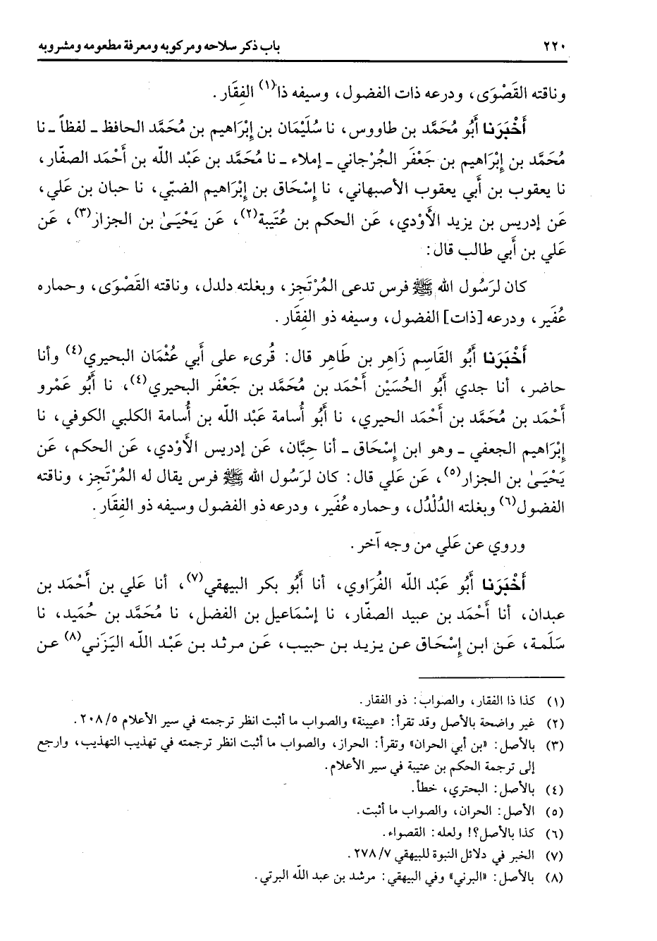 وناقته القصوى ودرعه ذات الفضول وسيفه ذا (1) الفقار أخبرنا أبو محمد بن طاووس نا سليمان بن إبراهيم بن محمد الحافظ لفظا نا محمد بن إبراهيم بن جعفر الجرجاني إملاء نا محمد بن عبد الله بن أحمد الصفار نا يعقوب بن أبي يعقوب الأصبهاني نا إسحاق بن إبراهيم الضبي نا حبان بن علي عن إدريس بن يزيد الأودي عن الحكم بن عتيبة (2) عن يحيى بن الجزار (3) عن علي بن أبي طالب قال كان لرسول الله (صلى الله عليه وسلم) فرس تدعى المرتجز وبغلته دلدل وناقته القصوى وحماره عفير ودرعه ذات الفضول وسيفه ذو الفقار أخبرنا أبو القاسم زاهر بن طاهر قال قرئ على أبي عثمان البحيري (4) وأنا حاضر أنا جدي أبو الحسين أحمد بن محمد بن جعفر البحيري (4) نا أبو عمرو أحمد بن محمد بن أحمد الحيري نا أبو أسامة عبد الله بن أسامة الكلبي الكوفي نا إبراهيم الجعفي وهو ابن إسحاق أنا حبان عن إدريس الأودي عن الحكم عن يحيى بن الجزار (5) عن علي قال كان لرسول الله (صلى الله عليه وسلم) فرس يقال له المرتجز وناقته الفضول (6) وبغلته الدلدل وحماره عفير ودرعه ذو الفضول وسيفه ذو الفقار وروي عن علي من وجه آخر أخبرنا أبو عبد الله الفراوي أنا أبو بكر البيهقي (7) أنا علي بن أحمد بن عبدان أنا أحمد بن عبيد الصفار نا إسماعيل بن الفضل نا محمد بن حميد نا سلمة عن ابن إسحاق عن يزيد بن حبيب عن مرثد بن عبد الله اليزني (8) عن