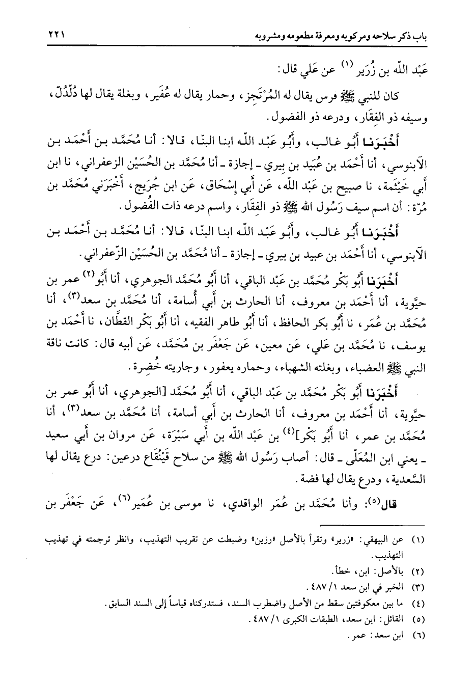 عبد الله بن زرير (1) عن علي قال كان للنبي (صلى الله عليه وسلم) فرس يقال له المرتجز وحمار يقال له عفير وبغلة يقال لها دلدل وسيفه ذو الفقار ودرعه ذو الفضول أخبرنا أبو غالب وأبو عبد الله ابنا البنا قالا أنا محمد بن أحمد بن الآبنوسي أنا أحمد بن عبيد بن بيري إجازة أنا محمد بن الحسين الزعفراني نا ابن أبي خيثمة نا صبيح بن عبد الله عن أبي إسحاق عن ابن جريج أخبرني محمد بن مرة أن اسم سيف رسول الله (صلى الله عليه وسلم) ذو الفقار واسم درعه ذات الفضول أخبرنا أبو غالب وأبو عبد الله ابنا البنا قالا أنا محمد بن أحمد بن الآبنوسي أنا أحمد بن عبيد بن بيري إجازة أنا محمد بن الحسين الزعفراني أخبرنا أبو بكر محمد بن عبد الباقي أنا أبو محمد الجوهري أنا أبو (2) عمر بن حيوية أنا أحمد بن معروف أنا الحارث بن أبي أسامة أنا محمد بن سعد (3) أنا محمد بن عمر نا أبو بكر الحافظ أنا أبو طاهر الفقيه أنا أبو بكر القطان نا أحمد بن يوسف نا محمد بن علي عن معين عن جعفر بن محمد عن أبيه قال كانت ناقة النبي (صلى الله عليه وسلم) العضباء وبغلته الشهباء وحماره يعفور وجاريته خضرة أخبرنا أبو بكر محمد بن عبد الباقي أنا أبو محمد الجوهري أنا أبو عمر بن حيوية أنا أحمد بن معروف أنا الحارث بن أبي أسامة أنا محمد بن سعد (3) أنا محمد بن عمر أنا أبو بكر (4) بن عبد الله بن أبي سبرة عن مروان بن أبي سعيد يعني ابن المعلى قال أصاب رسول الله (صلى الله عليه وسلم) من سلاح فينقاع درعين درع يقال لها السعدية ودرع يقال لها فضة قال (5) وأنا محمد بن عمر الواقدي نا موسى بن عمير (6) عن جعفر بن