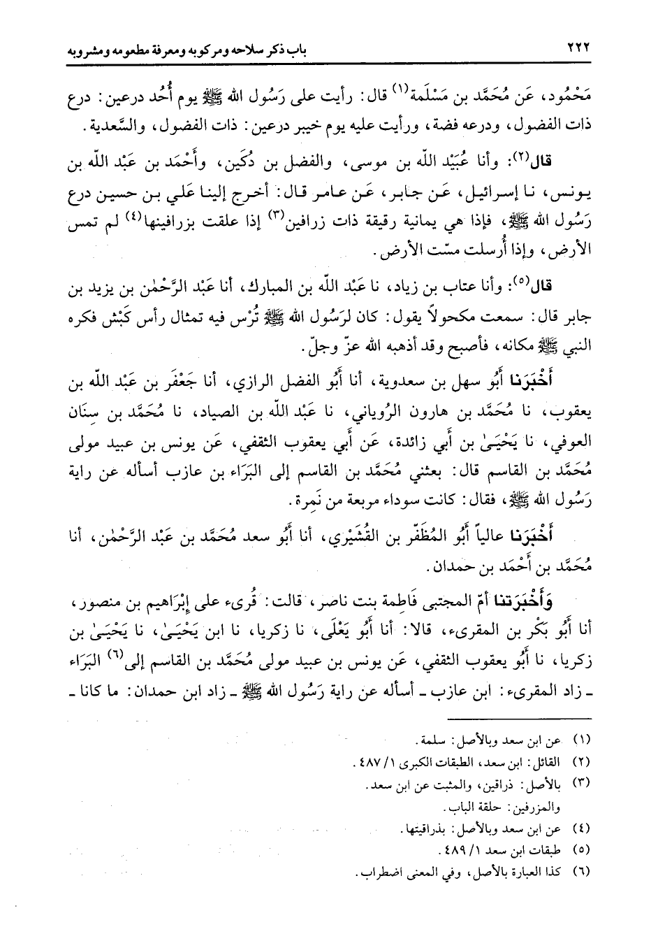 محمود عن محمد بن مسلمة (1) قال رأيت على رسول الله (صلى الله عليه وسلم) يوم أحد درعين درع ذات الفضول ودرعه فضة ورأيت عليه يوم خيبر درعين ذات الفضول والسعدية قال (2) وأنا عبيد الله بن موسى والفضل بن دكين وأحمد بن عبد الله بن يونس نا إسرائيل عن جابر عن عامر قال أخرج إلينا علي بن حسين درع رسول الله (صلى الله عليه وسلم) فإذا هي يمانية رقيقة ذات زرافين (3) إذا علقت بزرافينها (4) لم تمس الأرض وإذا أرسلت مست الأرض قال (5) وأنا عتاب بن زياد نا عبد الله بن المبارك أنا عبد الرحمن بن يزيد بن جابر قال سمعت مكحولا يقول كان لرسول الله (صلى الله عليه وسلم) ترس فيه تمثال رأس كبش فكره النبي (صلى الله عليه وسلم) مكانه فأصبح وقد أذهبه الله عز وجل أخبرنا أبو سهل بن سعدوية أنا أبو الفضل الرازي أنا جعفر بن عبد الله بن يعقوب نا محمد بن هارون الروياني نا عبد الله بن الصياد نا محمد بن سنان العوفي نا يحيى بن أبي زائدة عن أبي يعقوب الثقفي عن يونس بن عبيد مولى محمد بن القاسم قال بعثني محمد بن القاسم إلى البراء بن عازب أسأله عن راية رسول الله (صلى الله عليه وسلم) فقال كانت سوداء مربعة من نمرة أخبرنا عاليا أبو المظفر بن القشيري أنا أبو سعد محمد بن عبد الرحمن أنا محمد بن أحمد بن حمدان وأخبرتنا أم المجتبى فاطمة بنت ناصر قالت قرئ على إبراهيم بن منصور أنا أبو بكر بن المقرئ قالا أنا أبو يعلى نا زكريا نا ابن يحيى نا يحيى بن زكريا نا أبو يعقوب الثقفي عن يونس بن عبيد مولى محمد بن القاسم إلى (6) البراء زاد المقرئ ابن عازب أسأله عن راية رسول الله (صلى الله عليه وسلم) زاد ابن حمدان ما كانا