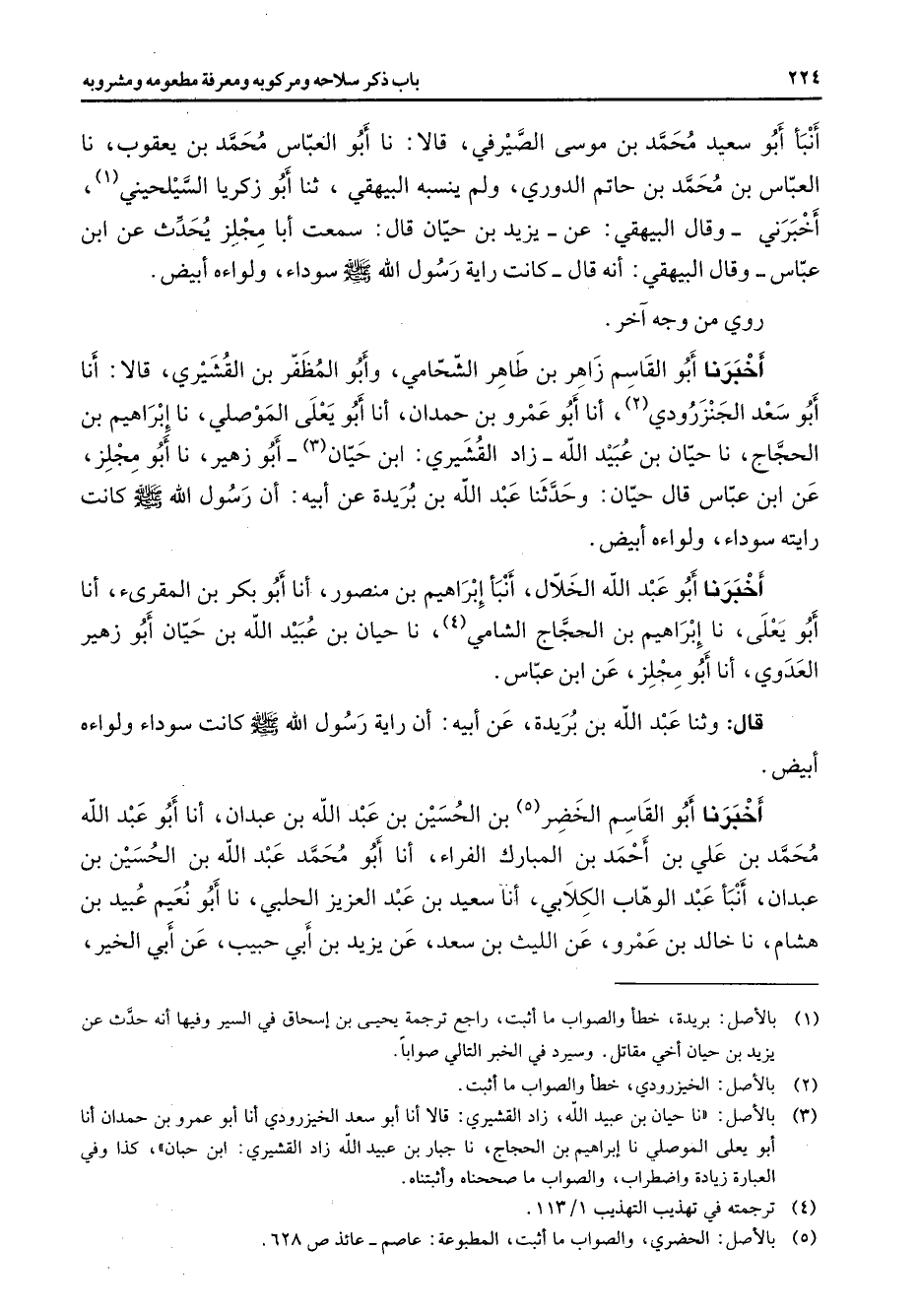 أنبأ أبو سعيد محمد بن موسى الصيرفي قالا نا أبو العباس محمد بن يعقوب نا العباس بن محمد بن حاتم الدوري ولم ينسبه البيهقي ثنا أبو زكريا السيلحيني (1) أخبرني وقال البيهقي عن يزيد بن حيان قال سمعت أبا مجلز يحدث عن ابن عباس وقال البيهقي أنه قال كانت راية رسول الله (صلى الله عليه وسلم) سوداء ولواءه أبيض روى من وجه آخر أخبرنا أبو القاسم زاهر بن طاهر الشحامي وأبو المظفر بن القشيري قالا أنا أبو سعد الجنزرودي (2) أنا أبو عمرو بن حمدان أنا أبو يعلى الموصلي نا إبراهيم بن الحجاج نا حيان بن عبيد الله زاد القشيري ابن حيان (3) أبو زهير نا أبو مجلز عن ابن عباس قال حيان وحدثنا عبد الله بن بريدة عن أبيه أن رسول الله (صلى الله عليه وسلم) كانت رايته سوداء ولواءه أبيض أخبرنا أبو عبد الله الخلال أنبأ إبراهيم بن منصور أنا أبو بكر بن المقرئ أنا أبو يعلى نا إبراهيم بن الحجاج الشامي (4) نا حيان بن عبيد الله بن حيان أبو زهير العدوي أنا أبو مجلز عن ابن عباس قال وثنا عبد الله بن بريدة عن أبيه أن راية رسول الله (صلى الله عليه وسلم) كانت سوداء ولواءه أبيض أخبرنا أبو القاسم الخضر (5) بن الحسين بن عبد الله بن عبدان أنا أبو عبد الله محمد بن علي بن أحمد بن المبارك الفراء أنا أبو محمد عبد الله بن الحسين بن عبدان أنبأ عبد الوهاب الكلابي أنا سعيد بن عبد العزيز الحلبي نا أبو نعيم عبيد بن هشام نا خالد بن عمرو عن الليث بن سعد عن يزيد بن أبي حبيب عن أبي الخير