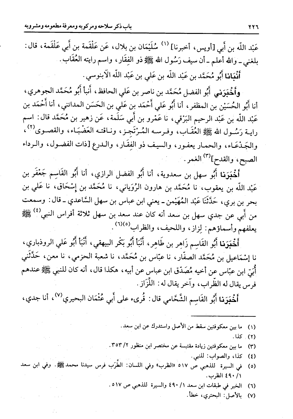 عبد الله بن أبي أويس أخبرنا (1) سليمان بن بلال عن علقمة بن أبي علقة قال بلغني والله أعلم أن سيف رسول الله (صلى الله عليه وسلم) ذو الفقار واسم رايته العقاب أنبأنا أبو محمد بن عبد الله بن علي بن عبد الله الآبنوسي وأخبرني أبو الفضل محمد بن ناصر بن علي الحافظ أنبأ أبو محمد الجوهري أنا أبو الحسين بن المظفر أنا أبو علي أحمد بن علي بن الحسن المدائني أنا أحمد بن عبد الله بن عبد الرحيم البرقي نا عمرو بن أبي سلمة عن زهير بن محمد قال اسم راية رسول الله (صلى الله عليه وسلم) العقاب وفرسه المرتجز وناقته العضباء والقصوى (2) والجدعاء والحمار يعفور والسيف ذو الفقار والدرع ذات الفضول والرداء الصبح والقدح (3) الغمر أخبرنا أبو سهل بن سعدوية أنا أبو الفضل الرازي أنا أبو القاسم جعفر بن عبد الله بن يعقوب نا محمد بن هارون الروياني نا محمد بن إسحاق نا علي بن بحر بن بري حدثنا عبد المهيمن يعني ابن عباس بن سهل الساعدي قال وسمعت من أبي عن جدي سهل بن سعد أنه كان عند سعد بن سهل ثلاثة أفراس النبي (4) (صلى الله عليه وسلم) يعلفهم وأسماؤهم لزاز واللحيف والظراب (5) (6) أخبرنا أبو القاسم زاهر بن طاهر أنبأ أبو بكر البيهقي أنبأ أبو علي الروذباري نا إسماعيل بن محمد الصفار نا عباس بن محمد نا شعبة الحزمي نا معن حدثني أبي ابن عباس عن أخيه مصدق ابن عباس عن أبيه هكذا قال أنه كان للنبي (صلى الله عليه وسلم) عندهم فرس يقال له الظراب وآخر يقال له اللزاز أخبرنا أبو القاسم الشحامي قال قرئ على أبي عثمان البحيري (7) أنا جدي
