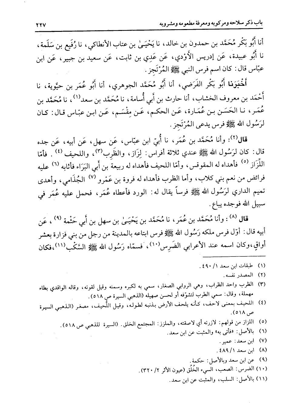 أنا أبو بكر محمد بن حمدون بن خالد نا يحيى بن عتاب الأنطاكي نا رفيع بن سلمة نا أبو عبيدة عن إدريس الأودي عن عدي بن ثابت عن سعيد بن جبير عن ابن عباس قال كان اسم فرس النبي (صلى الله عليه وسلم) المرتجز أخبرنا أبو بكر الفرضي أنا أبو محمد الجوهري أنا أبو عمر بن حيوية نا أحمد بن معروف الخشاب أنا حارث بن أبي أسامة نا محمد بن سعد (1) نا محمد بن عمر نا الحسن بن عمارة عن الحكم عن مقسم عن ابن عباس قال كان لرسول الله (صلى الله عليه وسلم) فرس يدعى المرتجز قال (2) وأنا محمد بن عمر نا أبي ابن عباس عن سهل عن أبيه عن جده قال كان لرسول الله (صلى الله عليه وسلم) عندي ثلاثة أفراس لزاز والظرب (3) واللحيف (4) فأما اللزاز (5) فأهداه له المقوقس وأما اللحيف فأهداه له ربيعة بن أبي البراء فأثابه (6) عليه فرائض من نعم بني كلاب وأما الظرب فأهداه له فروة بن عمرو (7) الجذامي وأهدى تميم الداري لرسول الله (صلى الله عليه وسلم) فرسا يقال له الورد فأعطاه عمر فحمل عليه عمر في سبيل الله فوجده يباع قال (8) وأنا محمد بن عمر نا محمد بن يحيى بن سهل بن أبي حثمة (9) عن أبيه قال أول فرس ملكه رسول الله (صلى الله عليه وسلم) فرس ابتاعه بالمدينة من رجل من بني فزارة بعشر أواق وكان اسمه عند الأعرابي الضرس (10) فسماه رسول الله (صلى الله عليه وسلم) السكب (11) فكان