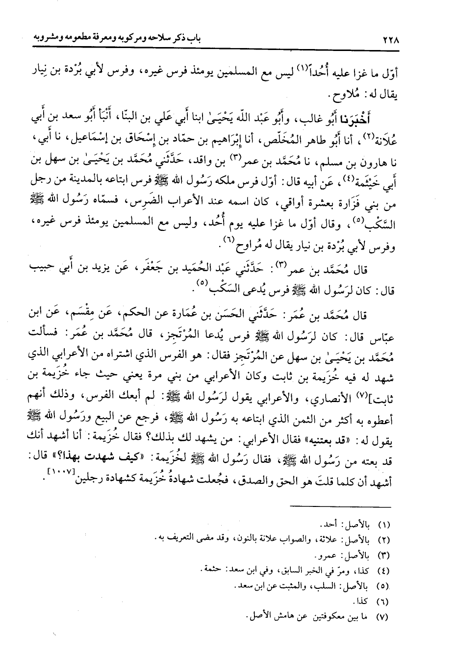 أول ما غزا عليه أحدا (1) ليس مع المسلمين يومئذ فرس غيره وفرس لأبي بردة بن نيار يقال له ملاوح أخبرنا أبو غالب وأبو عبد الله يحيى ابنا أبي علي بن البنا أنبأ أبو سعد بن أبي علانة (2) أنا أبو طاهر المخلص أنا إبراهيم بن حماد بن إسحاق بن إسماعيل نا أبي نا هارون بن مسلم نا محمد بن عمر (3) بن واقد حدثني محمد بن يحيى بن سهل بن أبي خيثمة (4) عن أبيه قال أول فرس ملكه رسول الله (صلى الله عليه وسلم) فرس ابتاعه بالمدينة من رجل من بني فزارة بعشرة أواقي كان اسمه عند الأعراب الضرس فسماه رسول الله (صلى الله عليه وسلم) السكب (5) وقال أول ما غزا عليه يوم أحد وليس مع المسلمين يومئذ فرس غيره وفرس لأبي بردة بن نيار يقال له مراوح (6) قال محمد بن عمر (3) حدثني عبد الحميد بن جعفر عن يزيد بن أبي حبيب قال كان لرسول الله (صلى الله عليه وسلم) فرس يدعى السكب (5) قال محمد بن عمر حدثني الحسن بن عمارة عن الحكم عن مقسم عن ابن عباس قال كان لرسول الله (صلى الله عليه وسلم) فرس يدعا المرتجز قال محمد بن عمر فسألت محمد بن يحيى بن سهل عن المرتجز فقال هو الفرس الذي اشتراه من الأعرابي الذي شهد له فيه خزيمة بن ثابت وكان الأعرابي من بني مرة يعني حيث جاء خزيمة بن ثابت (7) الأنصاري والأعرابي يقول لرسول الله (صلى الله عليه وسلم) لم أبعك الفرس وذلك أنهم أعطوه به أكثر من الثمن الذي ابتاعه به رسول الله (صلى الله عليه وسلم) فرجع عن البيع ورسول الله (صلى الله عليه وسلم) يقول له قد بعتنيه فقال الأعرابي من يشهد لك بذلك فقال خزيمة أنا أشهد أنك قد بعته من رسول الله (صلى الله عليه وسلم) فقال رسول الله (صلى الله عليه وسلم) لخزيمة كيف شهدت بهذا قال أشهد أن كلما قلت هو الحق والصدق فجعلت شهادة خزيمة كشهادة رجلين