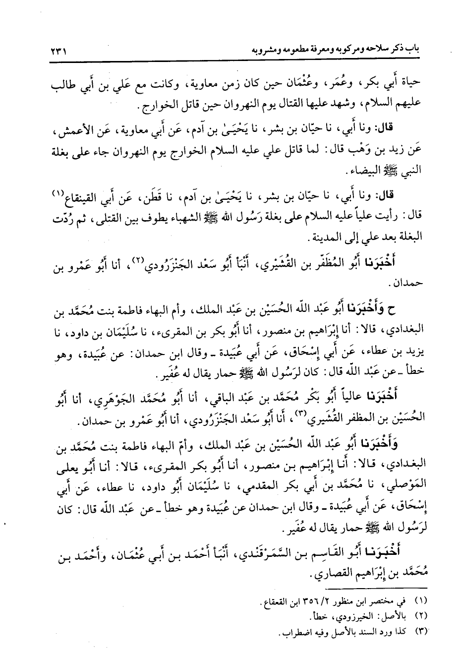 بقيت بعد رسول الله (صلى الله عليه وسلم) حياة أبي بكر وعمر وعثمان حين كان زمن معاوية وكانت مع علي بن أبي طالب عليهم السلام وشهد عليها القتال يوم النهروان حين قاتل الخوارج قال ونا أبي نا حيان بن بشر نا يحيى بن آدم عن أبي معاوية عن الأعمش عن زيد بن وهب قال لما قاتل علي عليه السلام الخوارج يوم النهراون جاء على بغلة النبي (صلى الله عليه وسلم) البيضاء قال ونا أبي نا حيان بن بشر نا يحيى بن آدم نا قطن عن أبي القينقاع (1) قال رأيت عليا عليه السلام على بغلة رسول الله (صلى الله عليه وسلم) الشهباء يطوف بين القتلى ثم ردت البغلة بعد علي إلى المدينة أخبرنا أبو المظفر بن القشيري أنبأ أبو سعد الجنزرودي (2) أنا أبو عمرو بن حمدان ح وأخبرنا أبو عبد الله الحسين بن عبد الملك وأم البهاء فاطمة بنت محمد بن البغدادي قالا أنا إبراهيم بن منصور أنا أبو بكر بن المقرئ نا سليمان بن داود نا يزيد بن عطاء عن أبي إسحاق عن أبي عبيدة وقال ابن حمدان عن عبيدة وهو خطأ عن عبد الله قال كان لرسول الله (صلى الله عليه وسلم) حمار يقال له عفير أخبرنا عاليا أبو بكر محمد بن عبد الباقي أنا أبو محمد الجوهري أنا أبو الحسين بن المظفر القشيري (3) أنا أبو سعد الجنزرودي أنا أبو عمرو بن حمدان وأخبرنا أبو عبد الله الحسين بن عبد الملك وأم البهاء فاطمة بنت محمد بن البغدادي قالا أنا إبراهيم بن منصور أنا أبو بكر المقرئ قالا أنا أبو يعلى الموصلي نا محمد بن أبي بكر المقدمي نا سليمان أبو داود نا عطاء عن أبي إسحاق عن أبي عبيدة وقال ابن حمدان عن عبيدة وهو خطأ عن عبد الله قال كان لرسول الله (صلى الله عليه وسلم) حمار يقال له عفير أخبرنا أبو القاسم بن السمرقندي أنبأ أحمد بن أبي عثمان وأحمد بن محمد بن إبراهيم القصاري