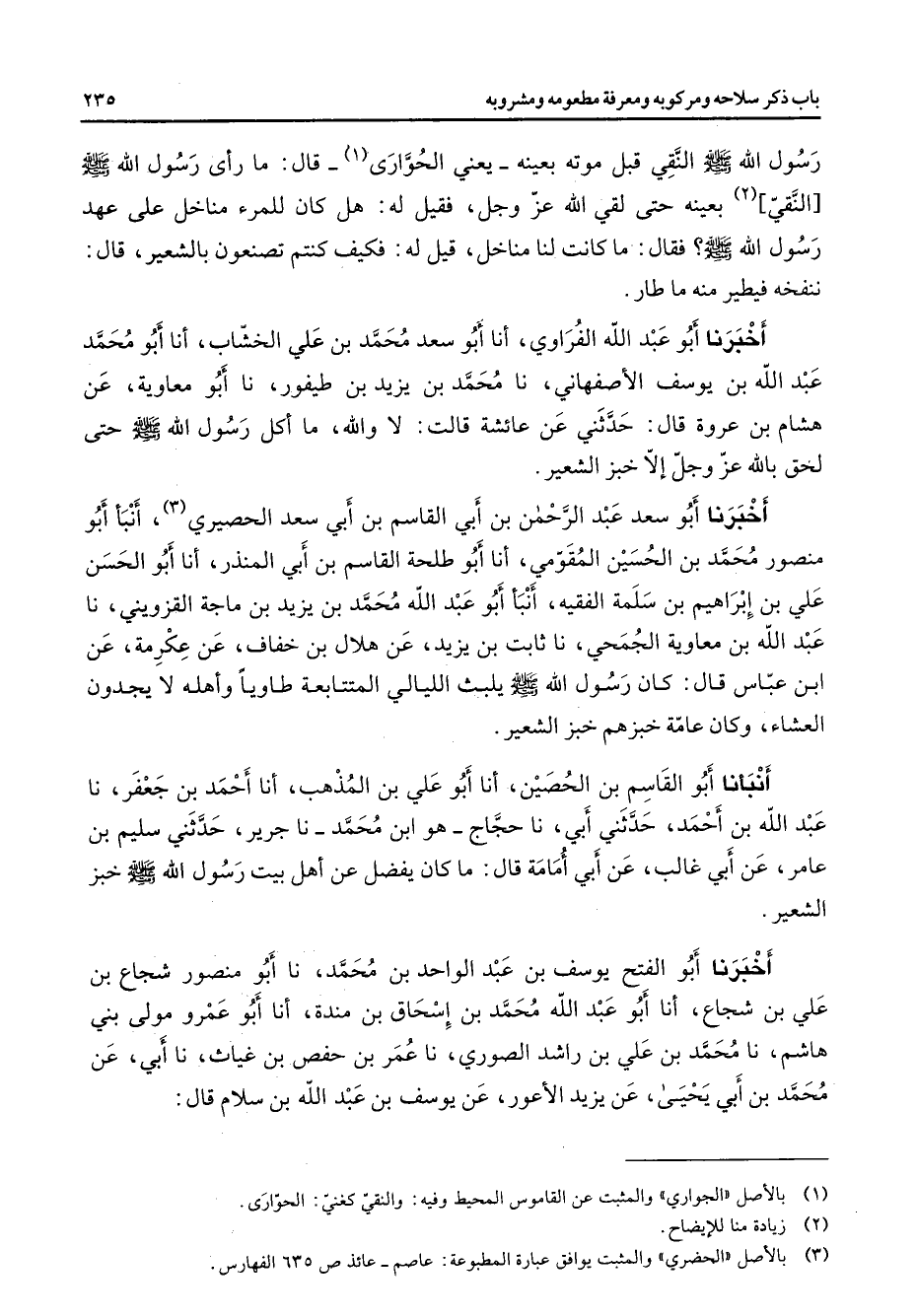 رسول الله (صلى الله عليه وسلم) النقي قبل موته بعينه يعني الحوارى (1) قال ما رأى رسول الله (صلى الله عليه وسلم) النقي (2) بعينه حتى لقي الله عز وجل فقيل له هل كان للمرء مناخل على عهد رسول الله (صلى الله عليه وسلم) فقال ما كانت لنا مناخل قيل له فكيف كنتم تصنعون بالشعير قال ننفخه فيطير منه ما طار أخبرنا أبو عبد الله الفراوي أنا أبو سعد محمد بن علي الخشاب أنا أبو محمد عبد الله بن يوسف الأصفهاني نا محمد بن يزيد بن طيفور نا أبو معاوية عن هشام بن عروة قال حدثني عن عائشة قالت لا والله ما أكل رسول الله (صلى الله عليه وسلم) حتى لحق بالله عز وجل إلا خبز الشعير أخبرنا أبو سعد عبد الرحمن بن أبي القاسم بن أبي سعد الحصيري (3) أنبأ أبو منصور محمد بن الحسين المقومي أنا أبو طلحة القاسم بن أبي المنذر أنا أبو الحسن علي بن إبراهيم بن سلمة الفقيه أنبأ أبو عبد الله محمد بن يزيد بن ماجة القزويني نا عبد الله بن معاوية الجمحي نا ثابت بن يزيد عن هلال بن خفاف عن عكرمة عن ابن عباس قال كان رسول الله (صلى الله عليه وسلم) يلبث الليالي المتتابعة طاويا وأهله لا يجدون العشاء وكان عامة خبزهم خبز الشعير أنبأنا أبو القاسم بن الحصين أنا أبو علي بن المذهب أنا أحمد بن جعفر نا عبد الله بن أحمد حدثني أبي نا حجاج هو ابن محمد نا جرير حدثني سليم بن عامر عن أبي غالب عن أبي أمامة قال ما كان يفضل عن أهل بيت رسول الله (صلى الله عليه وسلم) خبز الشعير أخبرنا أبو الفتح يوسف بن عبد الواحد بن محمد نا أبو منصور شجاع بن علي بن شجاع أنا أبو عبد الله محمد بن إسحاق بن مندة أنا أبو عمرو مولى بني هاشم نا محمد بن علي بن راشد الصوري نا عمر بن حفص بن غياث نا أبي عن محمد بن أبي يحيى عن يزيد الأعور عن يوسف بن عبد الله بن سلام قال