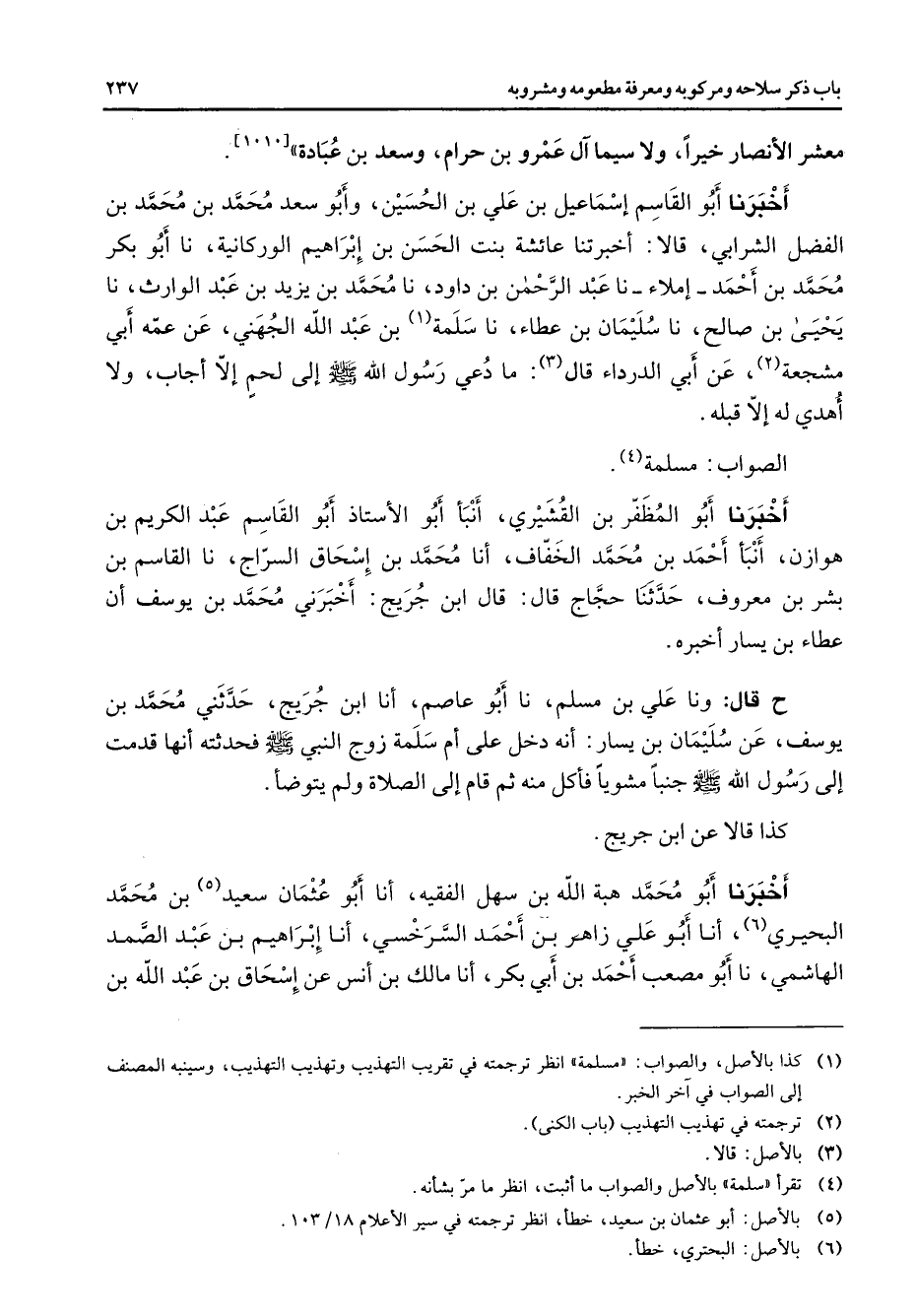 أخبرنا أبو المظفر بن القشيري أنبأ أبو الأستاذ أبو القاسم عبد الكريم بن هوازن أنبأ أحمد بن محمد الخفاف أنا محمد بن إسحاق السراج نا القاسم بن بشر بن معروف حدثنا حجاج قال قال ابن جريج أخبرني محمد بن يوسف أن عطاء بن يسار أخبره ح قال ونا علي بن مسلم نا أبو عاصم أنا ابن جريج حدثني محمد بن يوسف عن سليمان بن يسار أنه دخل على أم سلمة زوج النبي (صلى الله عليه وسلم) فحدثته أنها قدمت إلى رسول الله (صلى الله عليه وسلم) جنبا مشويا فأكل منه ثم قام إلى الصلاة ولم يتوضأ كذا قالا عن ابن جريج أخبرنا أبو محمد هبة الله بن سهل الفقيه أنا أبو عثمان سعيد (5) بن محمد البحيري (6) أنا أبو علي زاهر بن أحمد السرخسي أنا إبراهيم بن عبد الصمد الهاشمي نا أبو مصعب أحمد بن أبي بكر أنا مالك بن أنس عن إسحاق بن عبد الله