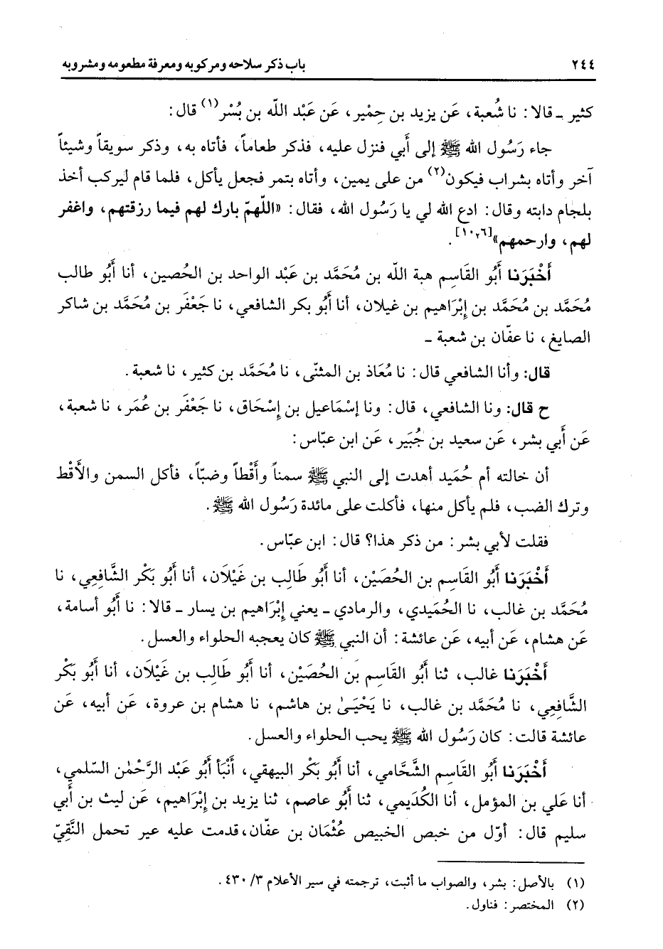 [1026] أخبرنا أبو القاسم هبة الله بن محمد بن عبد الواحد بن الحصين أنا أبو طالب محمد بن محمد بن إبراهيم بن غيلان أنا أبو بكر الشافعي نا جعفر بن محمد بن شاكر الصايغ نا عفان بن شعبة قال وأنا الشافعي قال نا نعاذ بن المثنى نا محمد بن كثير نا شعبة ح قال ونا الشافعي قال ونا إسماعيل بن إسحاق نا جعفر بن عمر نا شعبة عن أبي بشر عن سعيد بن جبير عن ابن عباس أن خالته أم حميد أهدت إلى النبي (صلى الله عليه وسلم) سمنا وأقطا وضبا فأكل السمن والأقط وترك الضب فلم يأكل منها فأكلت على مائدة رسول الله (صلى الله عليه وسلم) فقلت لأبي بشر من ذكر هذا ابن عباس أخبرنا أبو القاسم بن الحصين أنا أبو طالب بن غيلان أنا أبو بكر الشافعي نا محمد بن غالب نا الحميدي والرمادي يعني إبراهيم بن يسار قالا نا أبو أسامة عن هشام عن أبيه عن عائشة أن النبي (صلى الله عليه وسلم) كان يعجبه الحلواء والعسل أخبرنا غالب ثنا أبو القاسم بن الحصين أنا أبو طالب بن غيلان أنا أبو بكر الشافعي نا محمد بن غالب نا بحيى بن هاشم نا هشام بن عروة عن أبيه عن عائشة قالت كان رسول الله (صلى الله عليه وسلم) يحب الحلواء والعسل أخبرنا أبو القاسم الشحامي أنا أبو بكر البيهقي أنبأ عبد الرحمن السلمي أنا علي بن المؤمل أنا الكديمي ثنا أبو عاصم ثنا يزيد بن إبراهيم عن ليث بن أبي سليم قال أول من خبص الخبيص عثمان بن عفان قدمت عليه عير تحمل النقي