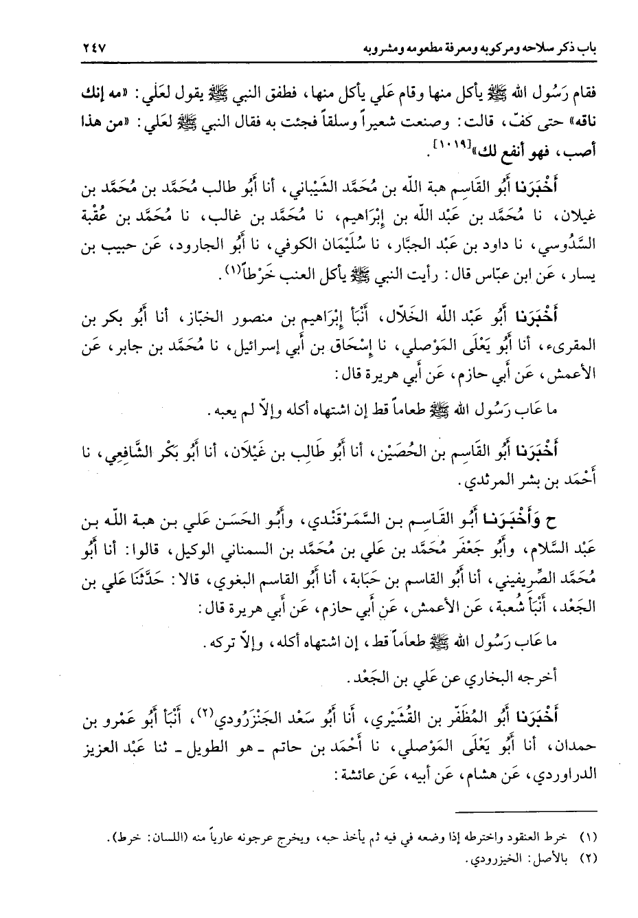 [1019] أخبرنا أبو القاسم هبة الله بن محمد الشيباني أنا أبو طالب محمد بن محمد بن غيلان نا محمد بن عبد الله بن إبراهيم نا محمد بن غالب نا محمد بن عقبة السدوسي نا داود بن عبد الجبار نا سليمان الكوفي نا أبو الجارود عن حبيب بن يسار عن ابن عباس قال رأيت النبي (صلى الله عليه وسلم) يأكل العنب خرطا (1) أخبرنا أبو عبد الله الخلال أنبأ إبراهيم بن منصور الخباز أنا أبو بكر بن المقرئ أنا أبو يعلى الموصلي نا إسحاق بن أبي إسرائيل نا محمد بن جابر عن الأعمش عن أبي حازم عن أبي هريرة قال ما عاب رسول الله (صلى الله عليه وسلم) طعاما قط إن اشتهاه أكله وإلا لم يعبه أخبرنا أبو القاسم بن الحصين أنا أبو طالب بن غيلان أنا أبو بكر الشافعي نا أحمد بن بشر المرثدي ح وأخبرنا أبو القاسم بن السمرقندي وأبو الحسن علي بن هبة الله بن عبد السلام وأبو جعفر محمد بن علي بن محمد السمناني الوكيل قالوا أنا أبو محمد الصريفيني أنا أبو القاسم بن حبابة أنا أبو القاسم البغوي قالا حدثنا علي بن الجعد أنبأ شعبة عن الأعمش عن أبي حازم عن أبي هريرة قال ما عاب رسول الله (صلى الله عليه وسلم) طعاما قط إن اشتهاه أكله وإلا تركه أخرجه البخاري عن علي بن الجعد اخبرنا أبو المظفر بن القشيري أنا أبو سعد الجنزرودي (2) أنبأ أبو عمرو بن حمدان أنا أبو يعلى الموصلي نا أحمد بن حاتم هو الطويل ثنا عبد العزيز الدراوردي عن هشام عن أبيه عن عائشة