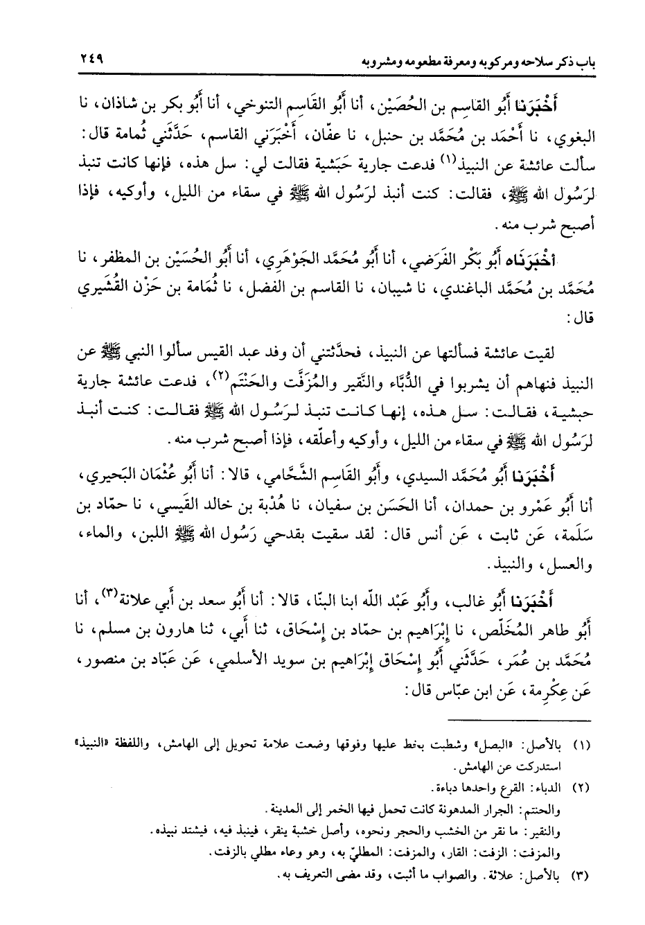 أخبرنا أبو القاسم بن الحصين أنا أبو القاسم التنوخي أنا أبو بكر بن شاذان نا البغوي نا أحمد بن محمد بن حنبل نا عفان أخبرني القاسم حدثني ثمامة قال سألت عائشة عن النبيذ (1) فدعت جارية حبشية فقالت لي سل هذه فإنها كانت تنبذ لرسول الله (صلى الله عليه وسلم) فقالت كنت أنبذ لرسول الله (صلى الله عليه وسلم) في سقاء من الليل وأوكيه فإذا أصبح شرب منه أخبرناه أبو بكر الفرضي أنا أبو محمد الجوهري أنا أبو الحسين بن المظفر نا محمد بن محمد الباغندي نا شيبان نا القاسم بن الفضل نا ثمامة بن حزن القشيري قال لقيت عائشة فسألتها عن النبيذ فحدثتني أن وفد عبد القيس سألوا النبي (صلى الله عليه وسلم) عن النبيذ فنهاهم أن يشربوا في الدباء والنقير والمزفت والحنتم فدعت عائشة جارية حبشية فقالت سل هذه إنها كانت تنبذ لرسول الله (صلى الله عليه وسلم) فقالت كنت أنبذ لرسول الله (صلى الله عليه وسلم) في سقاء من الليل وأوكيه وأعلقه فإذا أصبح شرب منه أخبرنا أبو محمد السيدي وأبو القاسم الشحامي قالا أنا أبو عثمان البحيري أنا أبو عمرو بن حمدان أنا الحسن بن سفيان نا هدبة بن خالد القيسي نا حماد بن سلمة عن ثابت عن أنس قال لقد سقيت بقدحي رسول الله (صلى الله عليه وسلم) اللبن والماء والعسل والنبيذ أخبرنا أبو غالب وأبو عبد الله ابنا البنا قالا أنا أبو سعد بن أبي علانة (3) أنا أبو طاهر المخلص نا إبراهيم بن حماد بن إسحاق ثنا أبي ثنا هارون بن مسلم نا محمد بن عمر حدثني أبو إسحاق إبراهيم بن سويد الأسلمي عن عباد بن منصور عن عكرمة عن ابن عباس قال