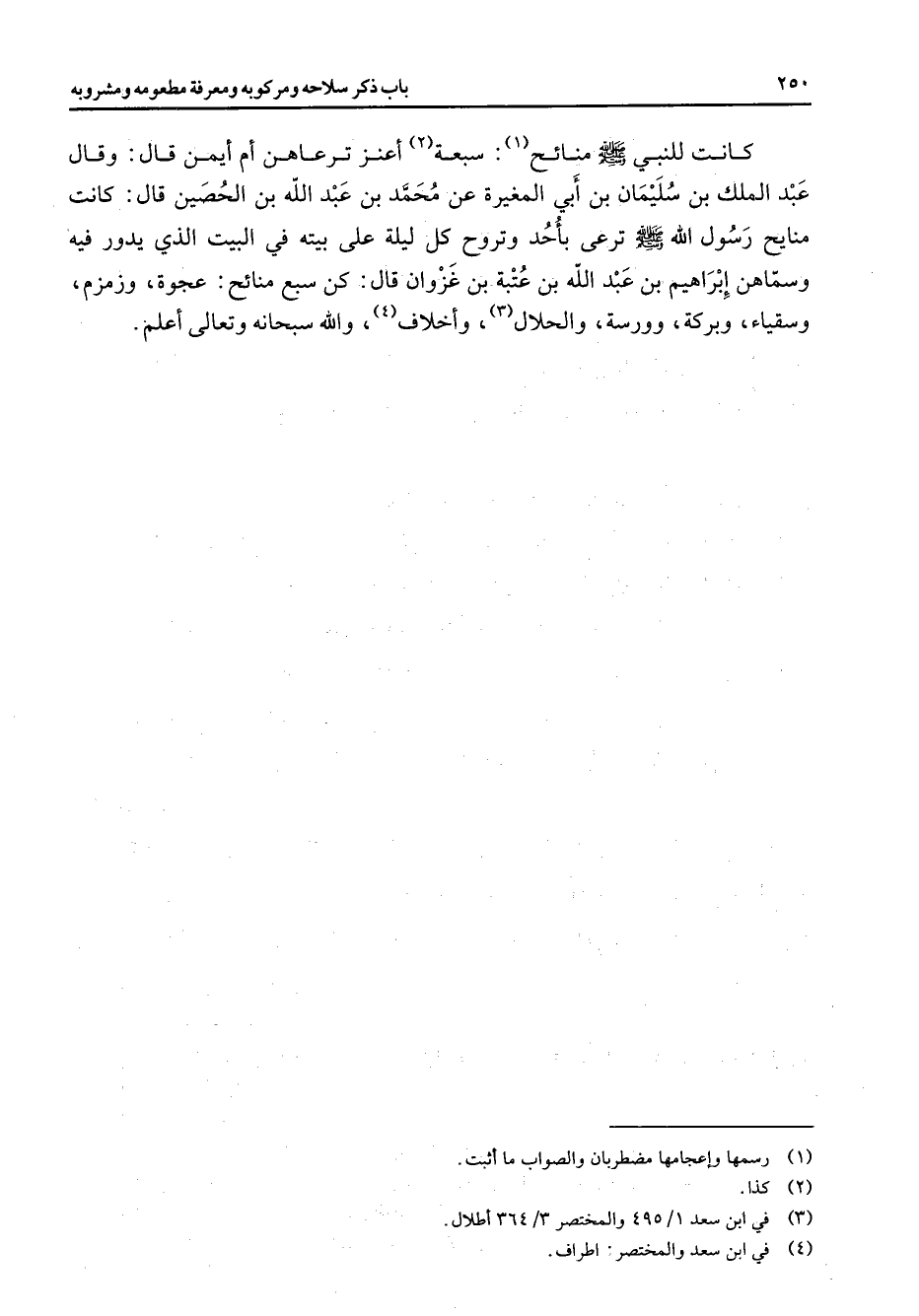كانت للنبي (صلى الله عليه وسلم) منائح (1) سبعة (2) أعنز ترعاهن أم أيمن قال وقال عبد الملك بن سليمان بن أبي المغيرة عن محمد بن عبد الله بن الحصين قال كانت منايح رسول الله (صلى الله عليه وسلم) ترعى بأحد وتروح كل ليلة على بيته في البيت الذي يدور فيه وسماهن إبراهيم بن عبد الله بن عتبة بن غزوان قال كن سبع منائح عجوة وزمزم وسقياء وبركة وورسة والحلال (3) وأخلاف (4) والله سبحانه وتعالى أعلم