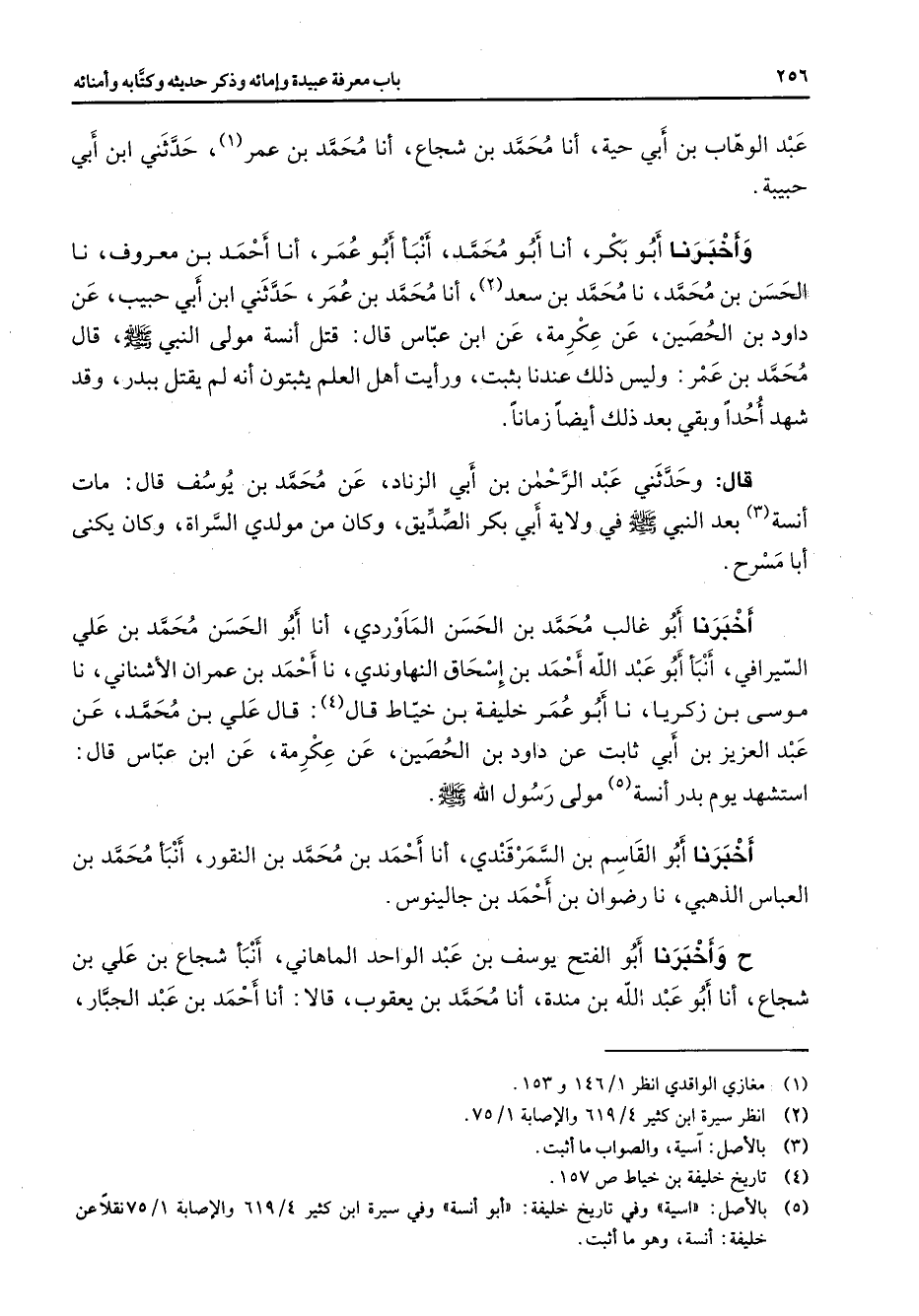 عبد الوهاب بن أبي حية أنا محمد بن شجاع أنا محمد بن عمر (1) حدثني ابن أبي حبيبة وأخبرنا أبو بكر أنا أبو محمد أنبأ أبو عمر أنا أحمد بن معروف نا الحسن بن محمد نا محمد بن سعد (2) أنا محمد بن عمر حدثني ابن أبي حبيب عن داود بن الحصين عن عكرمة عن ابن عباس قال قتل أنسة مولى النبي (صلى الله عليه وسلم) قال محمد بن عمر وليس ذلك عندنا بثبت ورأيت أهل العلم يثبتون أنه لم يقتل ببدر وقد شهد أحدا وبقي بعد ذلك أيضا زمانا قال وحدثني عبد الرحمن بن أبي الزناد عن محمد بن يوسف قال مات أنسة (3) بعد النبي (صلى الله عليه وسلم) في ولاية أبي بكر الصديق وكان من مولدي السراة وكان يكنى أبا مسرح أخبرنا أبو غالب محمد بن الحسن الماوردي أنا أبو الحسن محمد بن علي السيرافي أنبأ أبو عبد الله أحمد بن إسحاق النهاوندي نا أحمد بن عمران الأشناني نا موسى بن زكريا نا أبو عمر خليفة بن خياط قال (4) قال علي بن محمد عن عبد العزيز بن أبي ثابت عن داود بن الحصين عن عكرمة عن ابن عباس قال استشهد يوم بدر أنسة (5) مولى رسول الله (صلى الله عليه وسلم) أخبرنا أبو القاسم بن السمرقندي أنا أحمد بن محمد بن النقور أنبأ محمد ين العباس الذهبي نا رضوان بن أحمد بن جالينوس ح وأخبرنا أبو الفتح يوسف بن عبد الواحد الماهاني أنبأ شجاع بن علي بن شجاع أنا أبو عبد الله بن مندة أنا محمد بن يعقوب قالا أنا أحمد بن عبد الجبار