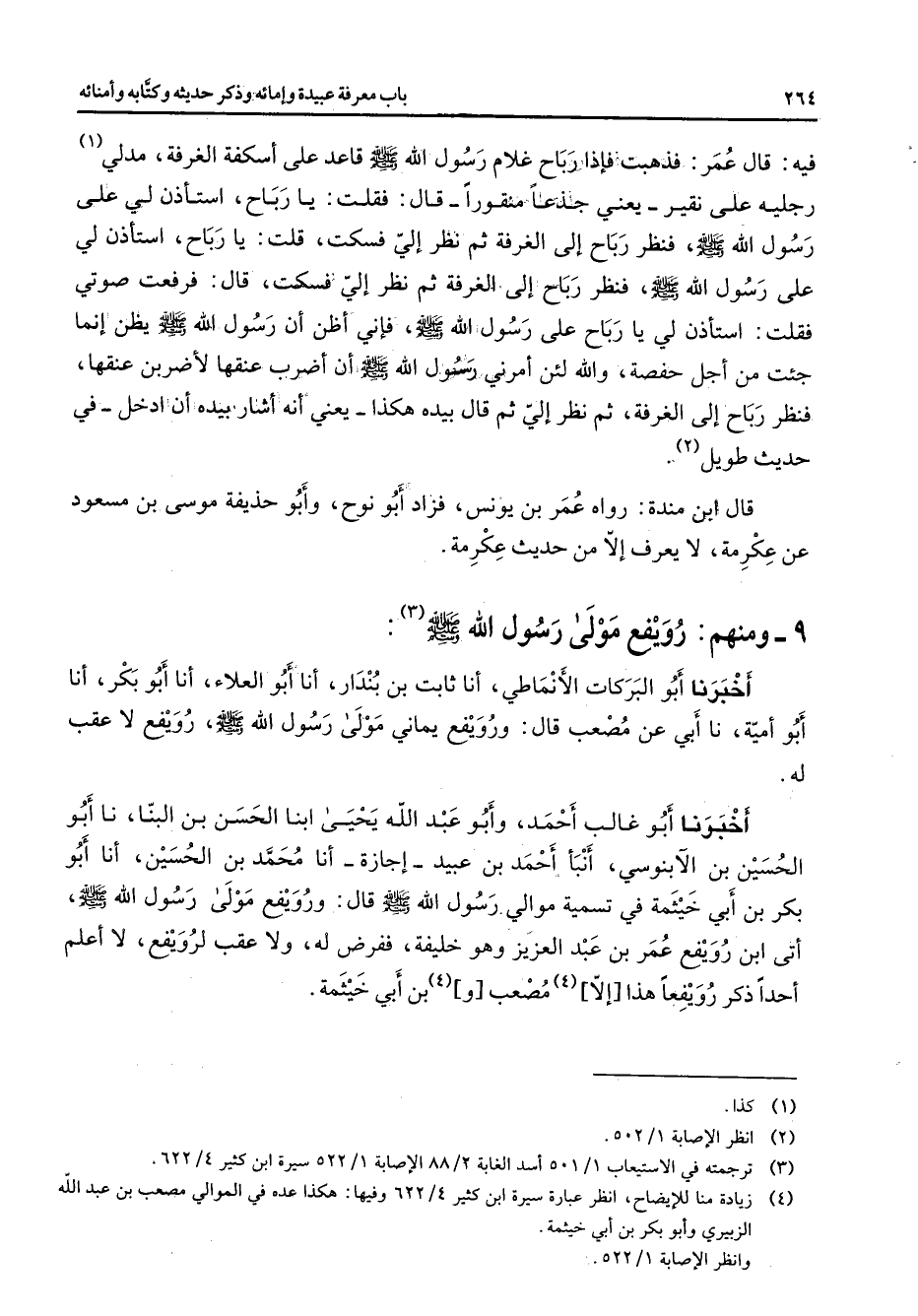 فيه قال عمر فذهبت فإذا رباح غلام رسول الله (صلى الله عليه وسلم) قاعد على أسكفة الغرفة مدلي (1) رجليه على نقير يعني جذعا منقورا قال فقلت يا رباح استأذن لي على رسول الله (صلى الله عليه وسلم) فنظر رباح إلى الغرفة ثم نظر إلي فسكت قلت يا رباح استأذن لي على رسول الله (صلى الله عليه وسلم) فنظر رباح إلى الغرفة ثم نظر إلي فسكت قال فرفعت صوتي فقلت استأذن لي يا رباح على رسول الله (صلى الله عليه وسلم) فإني أظن أن رسول الله (صلى الله عليه وسلم) يظن إنما جئت من أجل حفصة والله لئن أمرني رسول الله (صلى الله عليه وسلم) أن أضرب عنقها لأضربن عنقها فنظر رباح إلى الغرفة ثم نظر إلي ثم قال بيده هكذا يعني أنه أشار بيده أن ادخل في حديث طويل (2) قال ابن مندة رواه عمر بن يونس فزاد أبو نوح وأبو حذيفة موسى بن مسعود عن عكرمة لا يعرف إلا من حديث عكرمة 9 ومنهم رويفع مولى رسول الله (صلى الله عليه وسلم) (3) اخبرنا أبو البركات الأنماطي أنا ثابت بن بندار أنا أبو العلاء أنا أبو بكر أنا أبو أمية نا أبي عن مصعب قال ورويفع يماني مولى رسول الله (صلى الله عليه وسلم) رويفع لا عقب له أخبرنا أبو غالب أحمد وأبو عبد الله يحيى ابنا الحسن بن البنا نا أبو الحسين بن الآبنوسي أنبأ أحمد بن عبيد إجازة أنا محمد بن الحسين أنا أبو بكر بن أبي خثيمة في تسمية موالي رسول الله (صلى الله عليه وسلم) قال ورويفع مولى رسول الله (صلى الله عليه وسلم) أتى ابن رويفع عمر بن عبد العزيز وهو خليفة ففرض له ولا عقب لرويفع لا أعلم أحدا ذكر رويفعا هذا إلا (4) مصعب و (4) بن أبي خيثمة