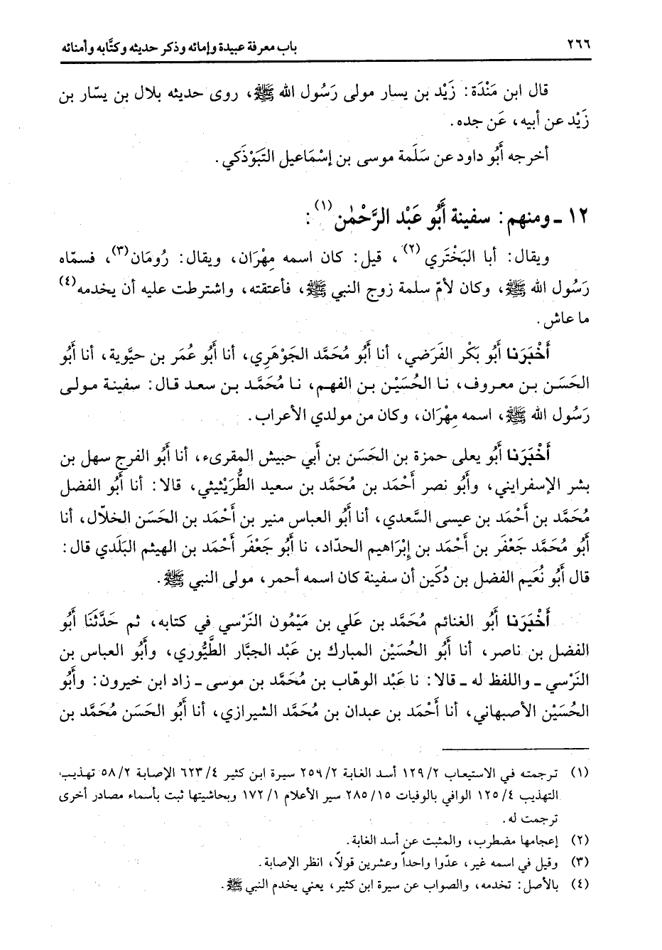 قال ابن مندة زيد بن يسار مولى رسول الله (صلى الله عليه وسلم) روى حديثه بلال بن يسار بن زيد عن أبيه عن جده أخرجه أبو داود عن سلمة موسى بن إسماعيل التبوذكي 12 ومنهم سفينة أبو عبد الرحمن (1) ويقال أبا البختري (2) قيل كان اسمه مهران ويقال رومان (3) فسماه رسول الله (صلى الله عليه وسلم) وكان لأم سلمة زوج النبي (صلى الله عليه وسلم) فأعتقته واشترطت عليه أن يخدمه (4) ما عاش