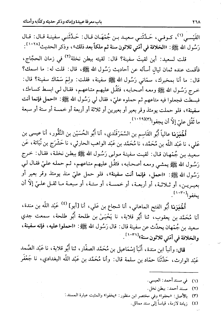 [1030] أخبرنا أبو الفتح الماهاني أنا شجاع بن علي أنا أبو (4) عبد الله بن مندة أنا محمد بن يعقوب ثنا أبو قلابة نا يحيى طلحة أبو طلحة سمعت جدي سعيد بن جمهان يحدث عن سفينة قال قال رسول الله (صلى الله عليه وسلم) احملوا عليه فإنه سفينة والخلافة في أمتي ثلاثون سنة [10 31] قال وأنبأ ابن مندة أنبأ إسماعيل بن محمد الصفار ثنا أبو قلابة نا عبد الصمد عبد الوارث حدثنا حماد بن سلمة وأنا محمد بن عبد الله البغدادي نا جعفر