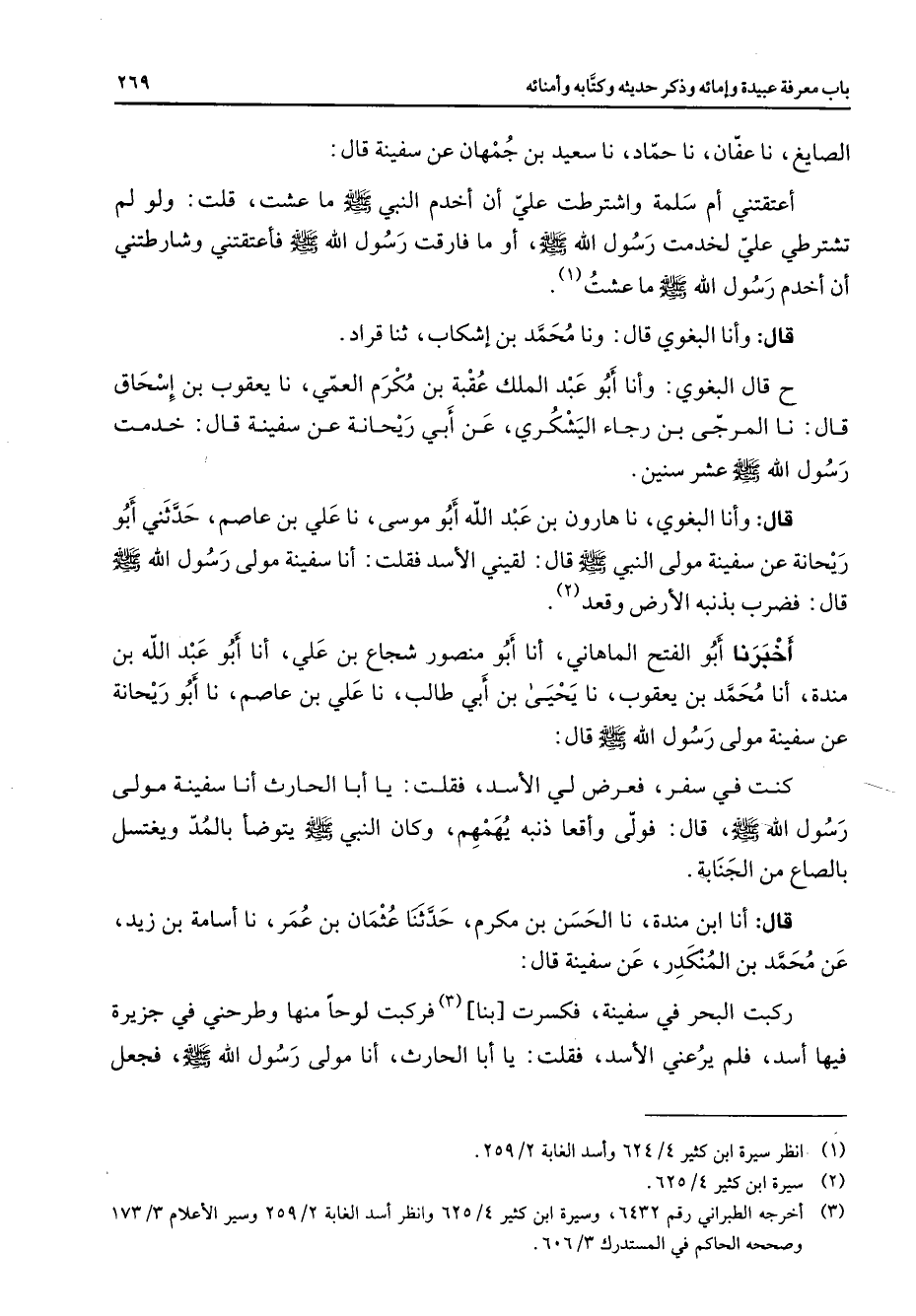 الصايغ نا عفان نا حماد نا سعيد بن جمهان عن سفينة قال أعتقتني أم سلمة واشترطت علي أن أخدم النبي (صلى الله عليه وسلم) ما عشت قلت ولو لم تشترطي علي لخدمت رسول الله (صلى الله عليه وسلم) أو ما فارقت رسول الله (صلى الله عليه وسلم) فأعتقني وشارطتني أن أحدم رسول الله (صلى الله عليه وسلم) ما عشت (1) قال وأنا البغوي قال ونا محمد بن إشكاب ثنا قراد ح قال البغوي وانا أبو عبد الملك عقبة بن مكرم العمي نا يعقوب بن إسحاق قال نا المرجي بن رجاء اليشكري عن أبي ريحانة عن سفينة قال خدمت رسول الله (صلى الله عليه وسلم) عشر سنين قال وأنا البغوي نا هارون بن عبد الله أبو موسى نا علي بن عاصم حدثني أبو ريحانة عن سفينة مولى النبي (صلى الله عليه وسلم) قال لقيني الأسد فقلت أنا سفينة مولى رسول الله (صلى الله عليه وسلم) قال فضرب بذنبه الأرض وقعد (2) أخبرنا أبو الفتح الماهاني أنا أبو منصور شجاع بن علي أنا أبو عبد الله بن مندة أنا محمد بن يعقوب نا يحيى بن أبي طالب نا علي بن عاصم نا أبو ريحانة عن سفينة مولى رسول الله (صلى الله عليه وسلم) قال كنت في سفر فعرض لي الأسد فقلت يا أبا الحارث أنا سفينة مولى رسول الله (صلى الله عليه وسلم) قال فولى وأقعا ذنبه يهمهم وكان النبي (صلى الله عليه وسلم) يتوضأ بالمد ويغتسل بالصاع من الجنابة قال أنا ابن مندة نا الحسن بن مكرم حدثنا عثمان بن عمر نا أسامة بن زيد عن محمد بن المنكدر عن سفينة قال ركبت البحر في سفينة فكسرت بنا (3) فركبت لوحا منها وطرحني في جزيرة فيها أسد فلم يرعني الأسد فقلت يا أبا الحارث أنا مولى رسول الله (صلى الله عليه وسلم) فجعل