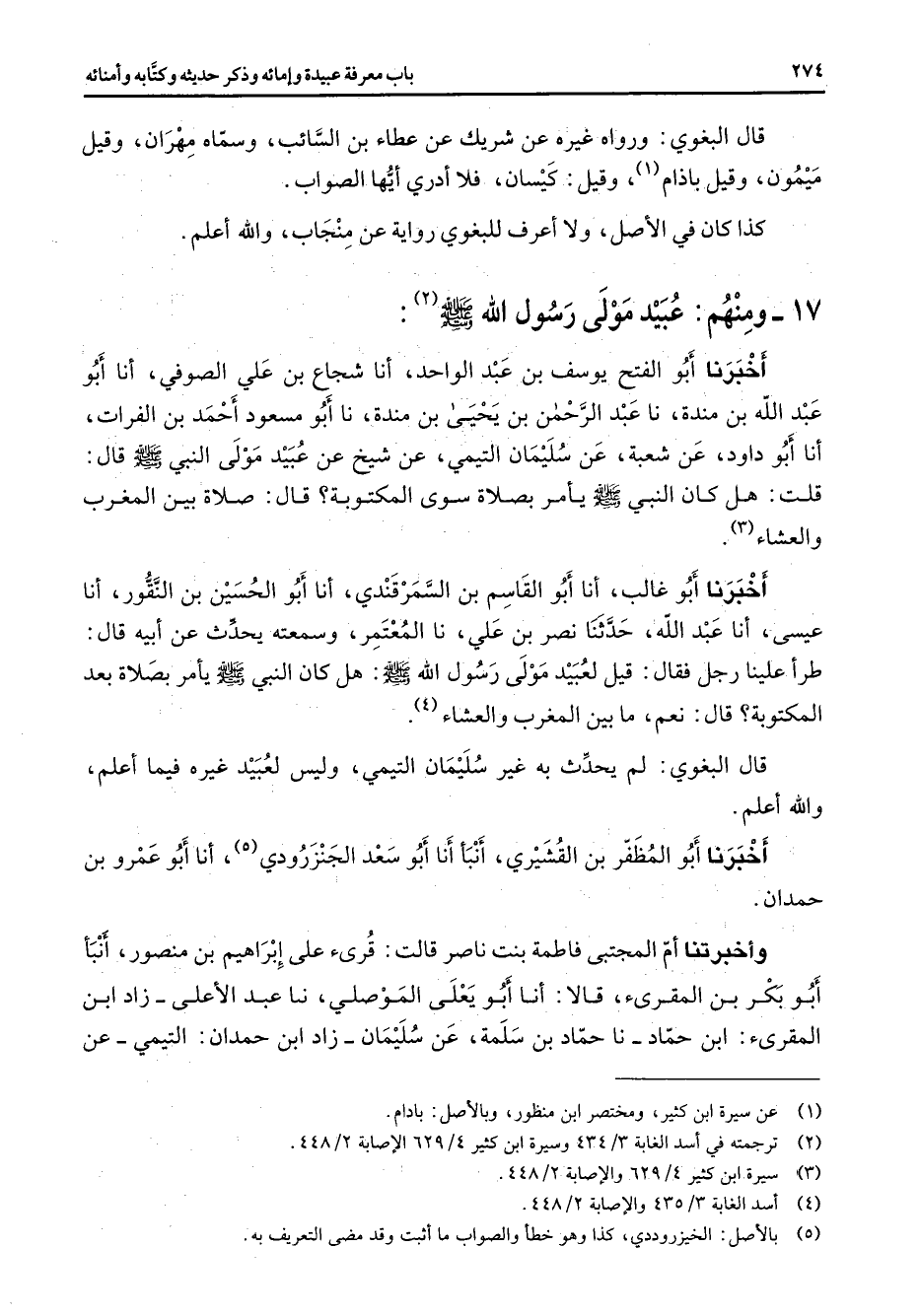 17 - ومنه عبيد مولى رسول الله (صلى الله عليه وسلم) (2) أخبرنا أبو الفتح يوسف بن عبد الواحد أنا شجاع بن علي الصوفي أنا أبو عبد الله بن مندة نا عبد الرحمن بن يحيى بن مندة نا أبو مسعود أحمد بن الفرات أنا أبو داود عن شعبة عن سليمان التيمي عن شيخ عن عبيد مولى النبي (صلى الله عليه وسلم) قال قلت هل كان النبي (صلى الله عليه وسلم) يأمر بصلاة سوى المكتوبة قال صلاة بين المغرب والعشاء (3) أخبرنا أبو غالب أنا أبو القاسم بن السمرقندي أنا أبو الحسين بن النقور أنا عيسى أنا عبد الله حدثنا نصر بن علي نا المعتمر وسمعته يحدث عن أبيه قال طرأ علينا رجل فقال قيل لعبيد مولى رسول الله (صلى الله عليه وسلم) هل كان النبي (صلى الله عليه وسلم) يأمر بصلاة بعد المكتوبة قال نعم ما بين المغرب والعشاء (4) قال البغوي لم يحدث به غير سليمان التيمي وليس لعبيد غيره فيما أعلم والله أعلم أخبرنا أبو المظفر بن القشيري أنبأ أنا أبو سعد الجنزرودي (5) أنا أبو عمرو بن حمدان وأخبرتنا أم المجتبى فاطمة بنت ناصر قالت قرئ على إبراهيم بن منصور أنبأ أبو بكر بن المقرئ قالا أنا أبو يعلى الموصلي نا عبد الأعلى زاد ابن المقرئ ابن حماد نا حماد بن سلمة عن سليمان زاد ابن حمدان التيمي عن
