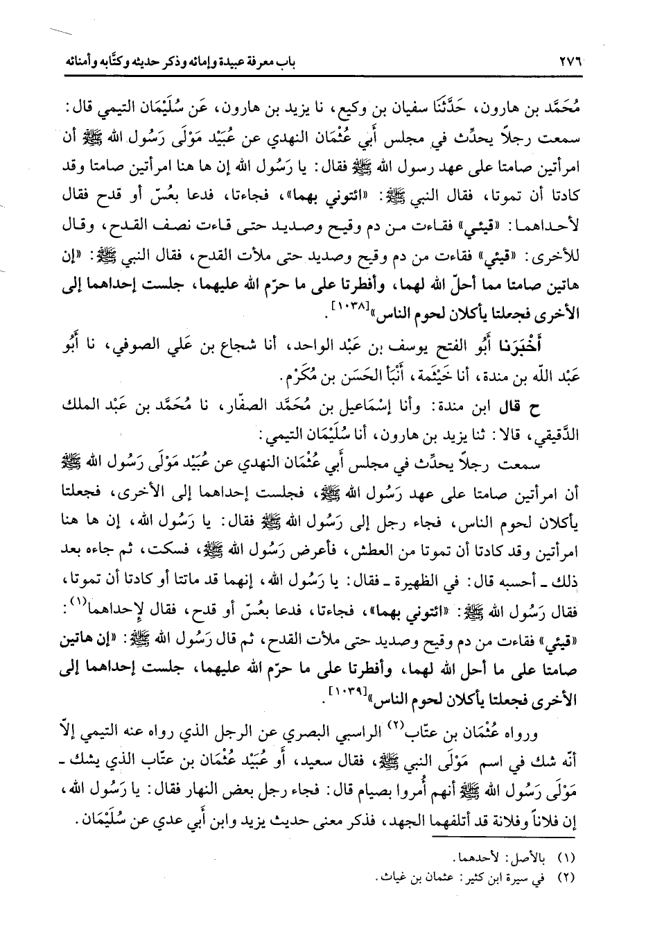 [1039] ورواه عثمان بن عتاب (2) الراسبي البصري عن الرجل الذي رواه عنه التيمي إلا أنه شك في اسم مولى النبي (صلى الله عليه وسلم) فقال سعيد أو عبيد عثمان بن عتاب الذي يشك مولى رسول الله (صلى الله عليه وسلم) أنهم أمروا بصيام قال فجاء رجل بعض النهار فقال يا رسول الله إن فلانا وفلانة قد أتلفهما الجهد فذكر معنى حديث يزيد وابن أبي عدي عن سليمان