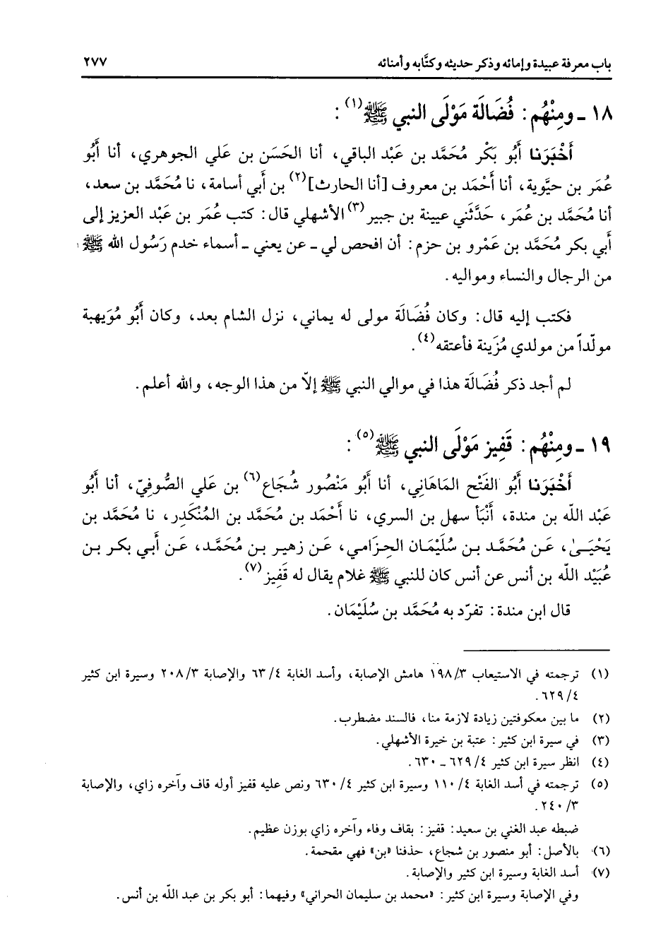 18 - ومنهم فضالة مولى النبي (صلى الله عليه وسلم) (1) أخبرنا أبو بكر محمد بن عبد الباقي أنا الحسن بن علي الجوهري أنا أبو عمر بن حيوية أنا أحمد بن معروف أنا الحارث (2) بن أبي أسامة نا محمد بن سعد أنا محمد بن عمر حدثني عيينة بن جبير (3) الأشهلي قال كتب عمر بن عبد العزيز إلى أبي بكر محمد بن عمرو بن حزم أن افحص لي عن يعني أسماء خدم رسول الله (صلى الله عليه وسلم) من الرجال والنساء ومواليه فكتب إليه قال وكان فضالة مولى له يماني نزل الشام بعد وكان أبو مويهبة مولدا من مولدي مزينة فأعتقه (4) لم أجد ذكر فضالة هذا في موالي النبي (صلى الله عليه وسلم) إلا من هذا الوجه والله أعلم 19 ومنهم قفيز مولى النبي (صلى الله عليه وسلم) (5) أخبرنا أبو الفتح الماهاني أنا أبو منصور شجاع (6) بن علي الصوفي أنا أبو عبد الله بن مندة أنبأ سهل بن السري نا أحمد بن محمد بن المنكدر نا محمد بن يحيى عن محمد بن سليمان الحزامي عن زهير بن محمد عن أبي بكر بن عبيد الله بن أنس عن أنس كان للنبي (صلى الله عليه وسلم) غلام يقال له قفيز (7) قال ابن مندة تفرد به محمد بن سليمان