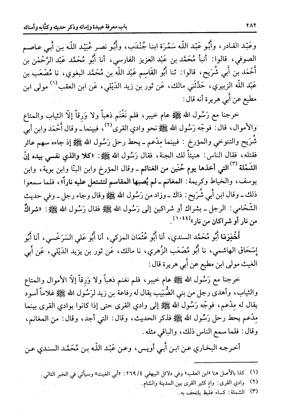 [1044] أخبرنا أبو محمد السندي أنا أبو عثمان المزكي أنا أبو علي السرخسي أنا أبو إسحاق الهاشمي نا أبو مصعب الزهري نا مالك عن ثور بن يزيد الديلي عن أبي الغيث مولى ابن مطيع عن أبي هريرة قال خرجنا مع رسول الله (صلى الله عليه وسلم) عام خيبر فلم نغنم ذهبا ولا ورقا إلا الأموال والمتاع والثياب وأهدى رجل من بني الضبيب يقال له رفاعة بن زيد لرسول الله (صلى الله عليه وسلم) غلاما أسود يقال له مدعم فوجه رسول الله (صلى الله عليه وسلم) إلى وادي القرى حتى إذا كانوا بوادي القرى بينما مدعم يحط رحل رسول الله (صلى الله عليه وسلم) فذكر الحديث وقال التي أجد وقال من المغانم وقال فلما سمع الناس ذلك والباقي مثله أخرجه البخاري عن ابن أبي أويس وعن عبد الله بن محمد السندي عن