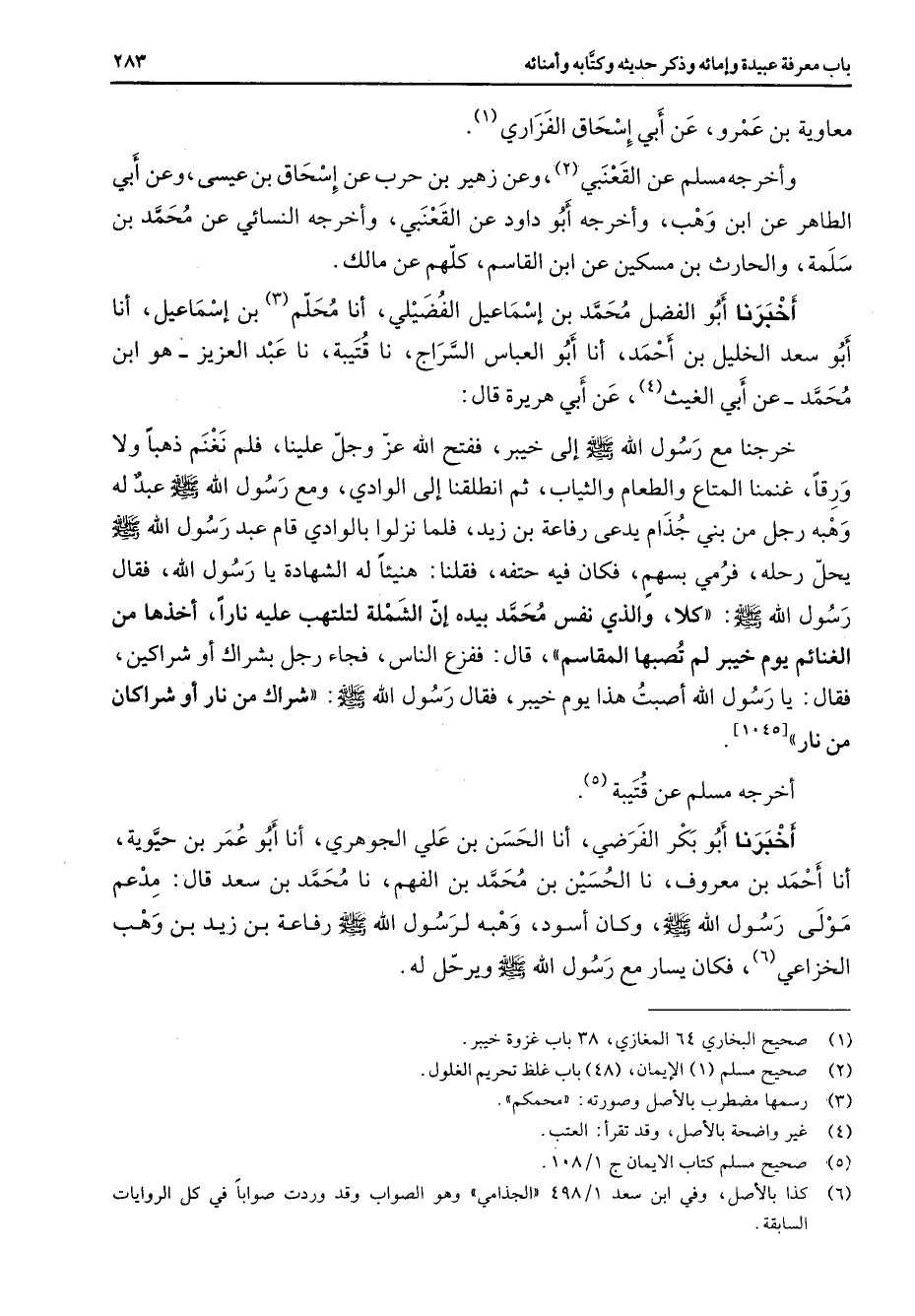 معاوية بن عمرو عن أبي إسحاق الفزاري (1) وأخرجه مسلم عن القعنبي (2) وعن زهير بن حرب عن إسحاق بن عيسى وعن أبي الطاهر عن ابن وهب وأخرجه أبو داود عن القعنبي وأخرجه النسائي عن محمد بن سلمة والحارث بن مسكين عن ابن القاسم كلهم عن مالك أخبرنا أبو الفضل محمد بن إسماعيل الفضيلي أنا محلم (3) بن إسماعيل أنا أبو سعد الخليل بن أحمد أنا أبو العباس السراج نا قتيبة نا عبد العزيز هو ابن محمد عن أبي الغيث (4) عن أبي هريرة قال خرجنا مع رسول الله (صلى الله عليه وسلم) إلى خيبر ففتح الله عز وجل علينا فلم نغنم ذهبا ولا ورقا غنمنا المتاع والطعام والثياب ثم انطلقنا إلى الوادي ومع رسول الله (صلى الله عليه وسلم) عبد له وهبه رجل من بني جذام يدعى رفاعة بن زيد فلما نزلوا بالوادي قام عبد رسول الله (صلى الله عليه وسلم) يحل رحله فرمى بسهم فكان فيه حتفه فقلنا هنيئا له الشهادة يا رسول الله فقال رسول الله (صلى الله عليه وسلم) كلا والذي نفس محمد بيده إن الشملة لتلتهب عليه نارا أخذها من الغنائم يوم خيبر لم تصبها المقاسم قال ففزع الناس فجاء رجل بشراك أو شراكين فقال يا رسول الله أصبت هذا يوم خيبر فقال رسول الله (صلى الله عليه وسلم) شراك من نار أو شراكان من نار